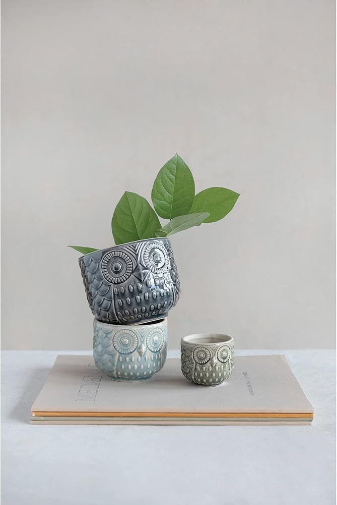 Display these stunning decorative accents to effortlessly enhance the design of any living space; Made from 100% stoneware; Large owl measures 5" Round x 4.25" H, Medium owl measures 4" Round x 3" H, Small owl measures 2.75" Round x 2.25" H