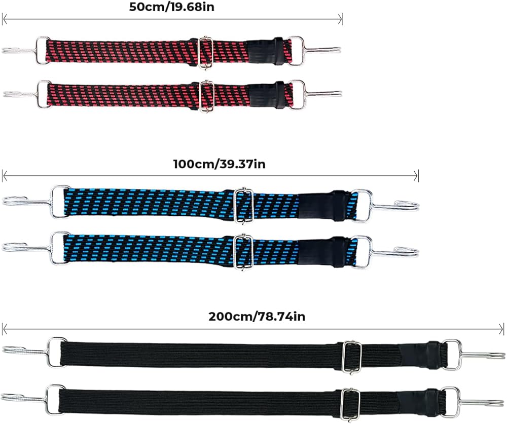 طول قابل للتعديل - قم بتوسيع وتقليص كل بنجي عن طريق ضبط الإبزيم المنزلق. تغطي الحزمة المتنوعة نطاقًا يتراوح من 80 بوصة إلى 12 بوصة. 80"→ 38"---- 40"→ 20"----20"→ 12"