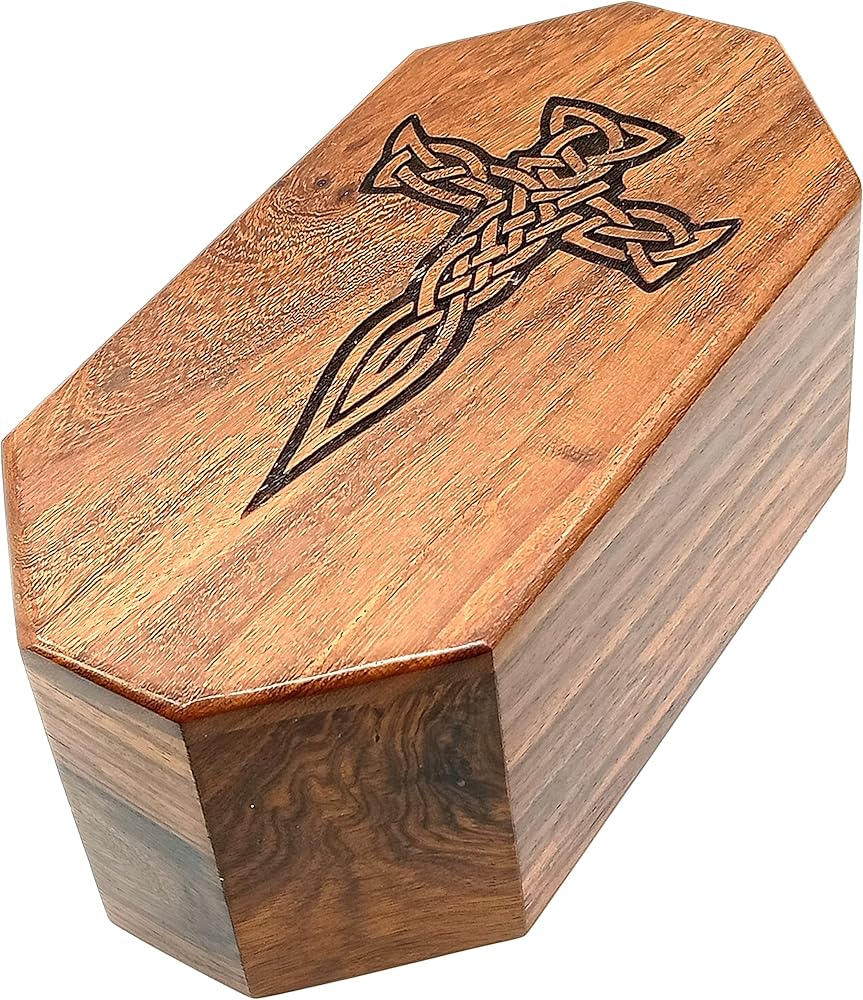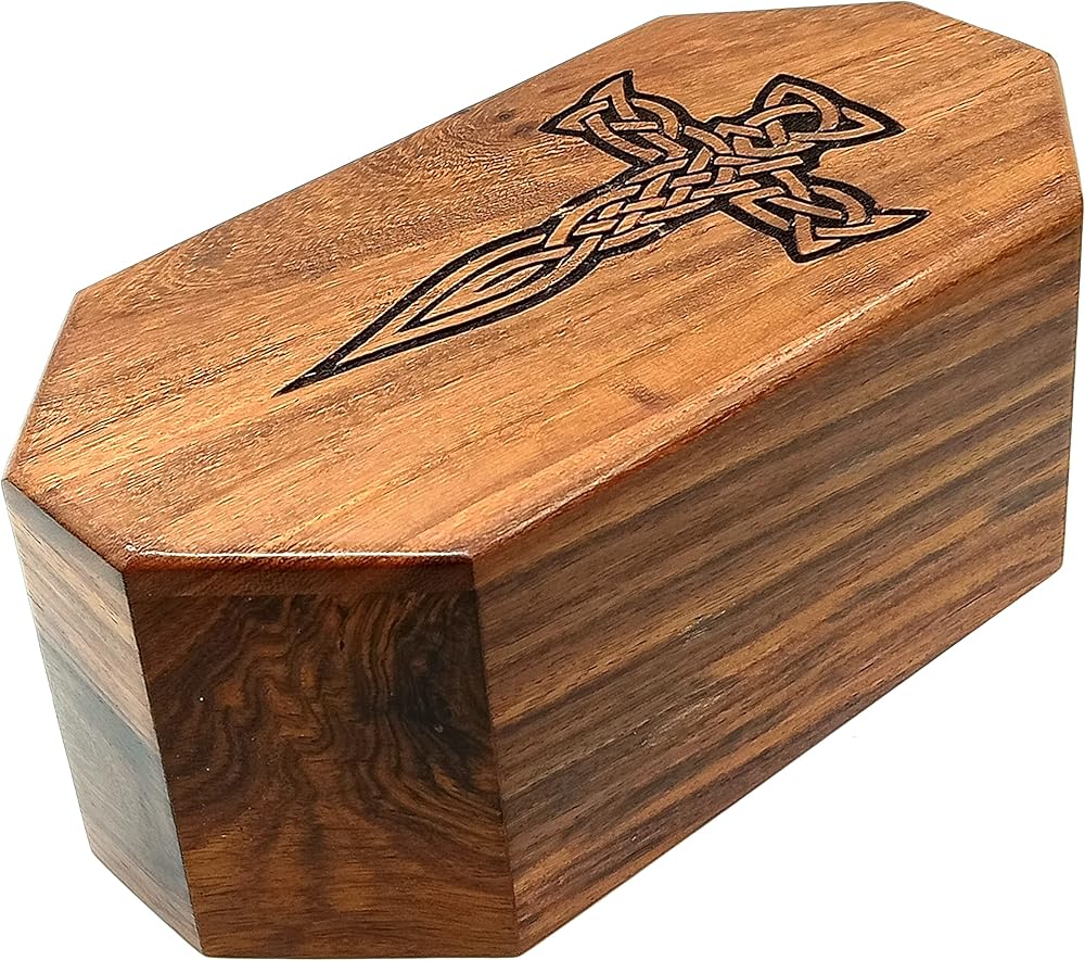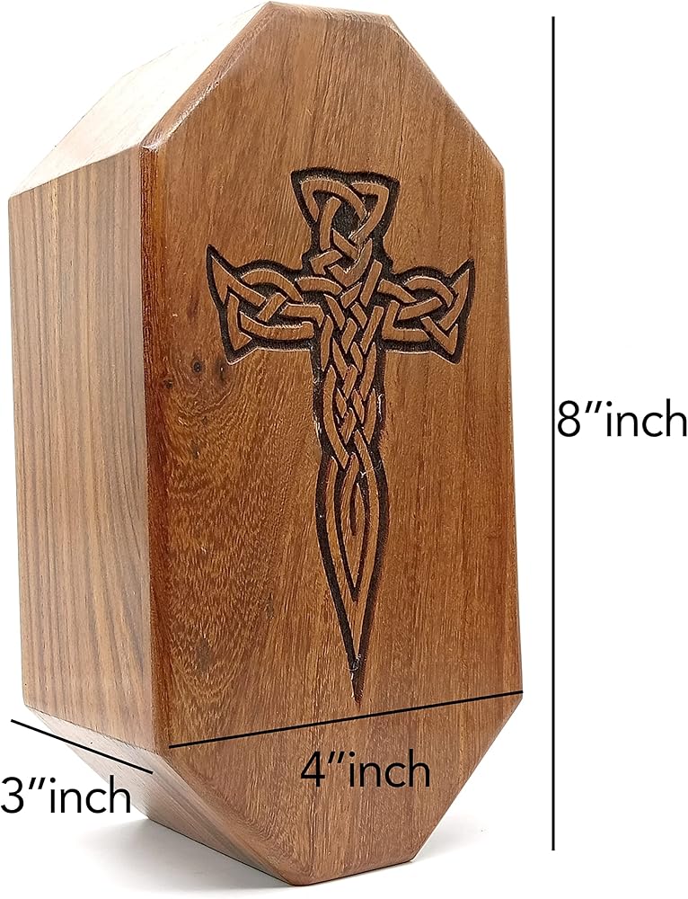 التصميم والأبعاد: نقش صليب جميل. حجم الجرة الخشبية هو 8 بوصات طول × 4 بوصات عرض × 3 بوصات ارتفاع. يتمتع صندوق الجرة هذا بسعة للبالغين تصل إلى 120 رطلًا وحجم صغير {500 جرام إلى 800 جرام رماد تقريبًا}
