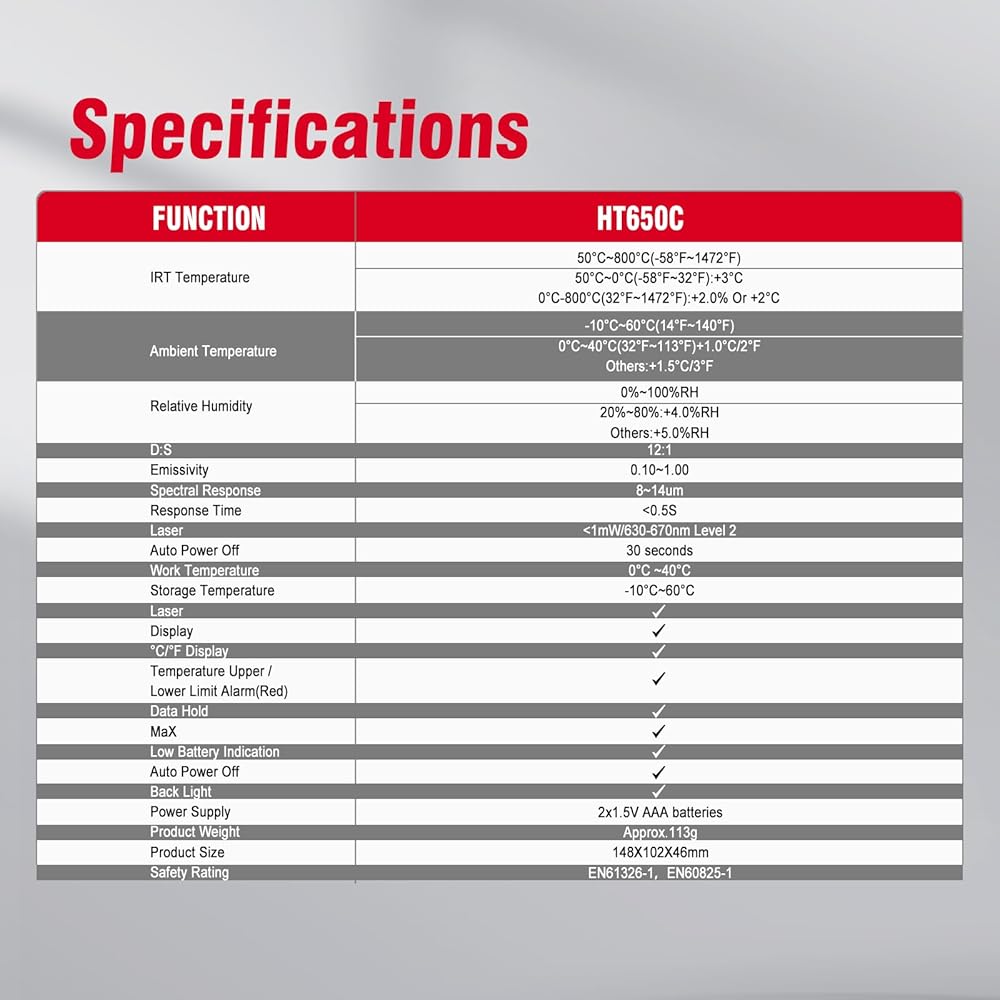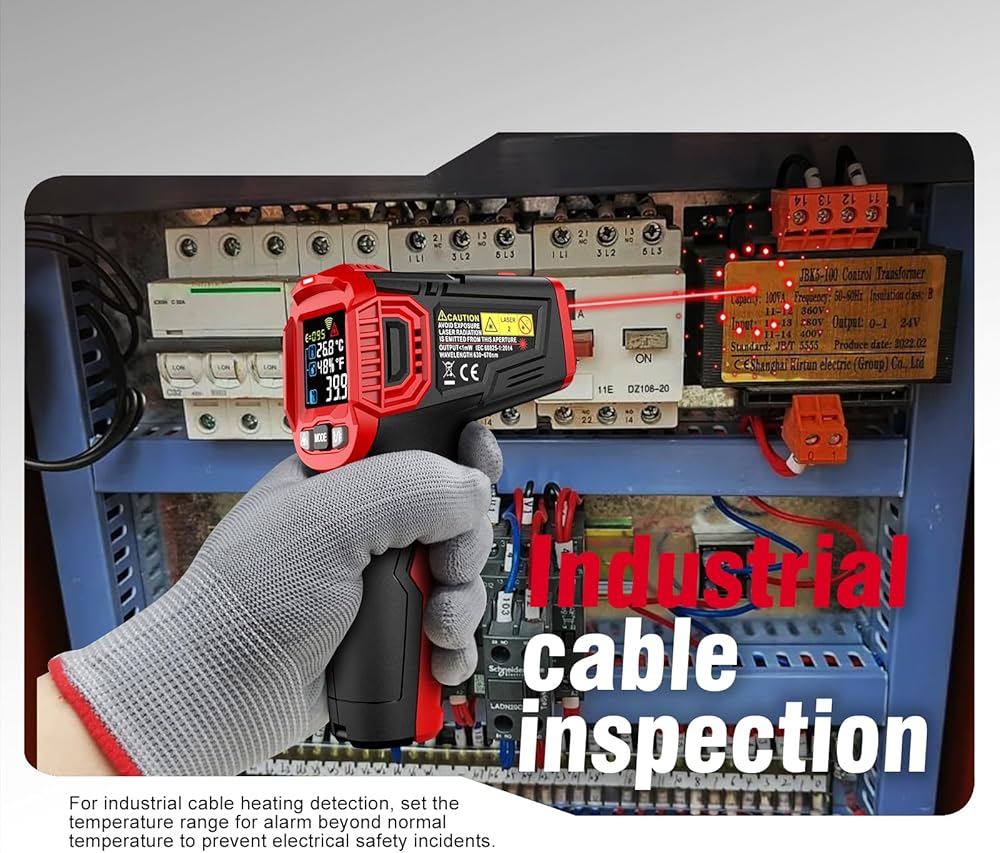 [سهل الاستخدام] ما عليك سوى توجيه مقياس الحرارة إلى الجسم الذي تريد قياسه والنقر عليه للحصول على القراءة. يساعد الليزر المنبعث من الجهاز في إرشادك أثناء التصويب والتقاط الصور. قم بقياس درجات الحرارة في نطاق من -58 درجة فهرنهايت إلى 1472 درجة فهرنهايت (-50 درجة مئوية ~ 800 درجة مئوية). بالنسبة لدرجة الحرارة المرتفعة، أو الأشياء السامة أو التي يصعب الوصول إليها، يمكن قياس استخدام هذا المنتج بأمان.