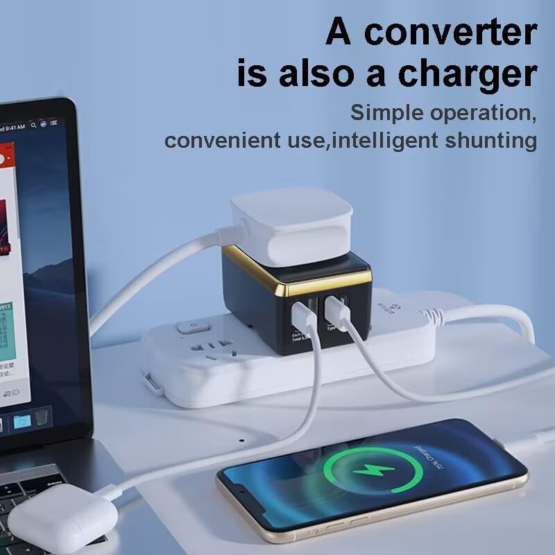 محول سفر 6 في 1 - اشحن ما يصل إلى 5 أجهزة في وقت واحد بسرعة عالية باستخدام منفذي USB-A (3A)، ومنفذي USB-C (3A)، ومقبس تيار متردد واحد. مثالي لشحن أجهزة iPhone وأجهزة الكمبيوتر المحمولة والأجهزة اللوحية وبنوك الطاقة والكاميرات وسماعات الرأس والمزيد.