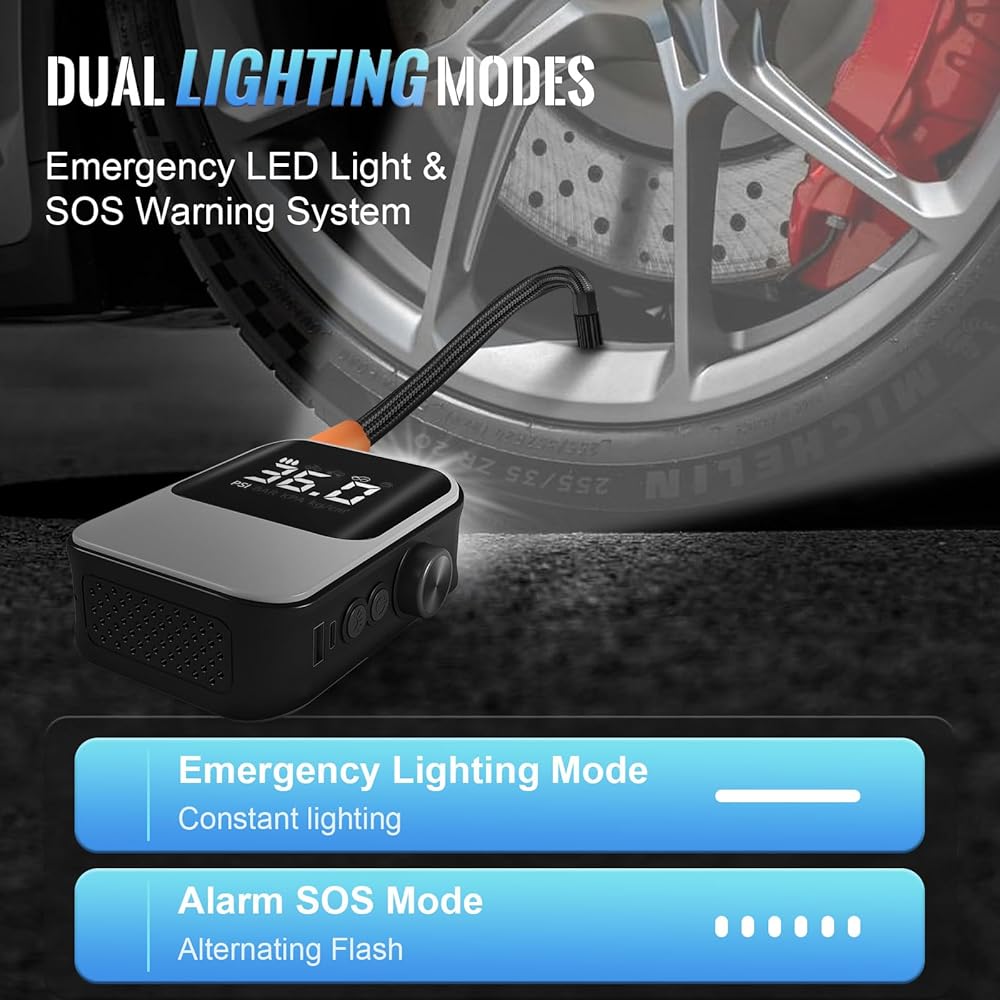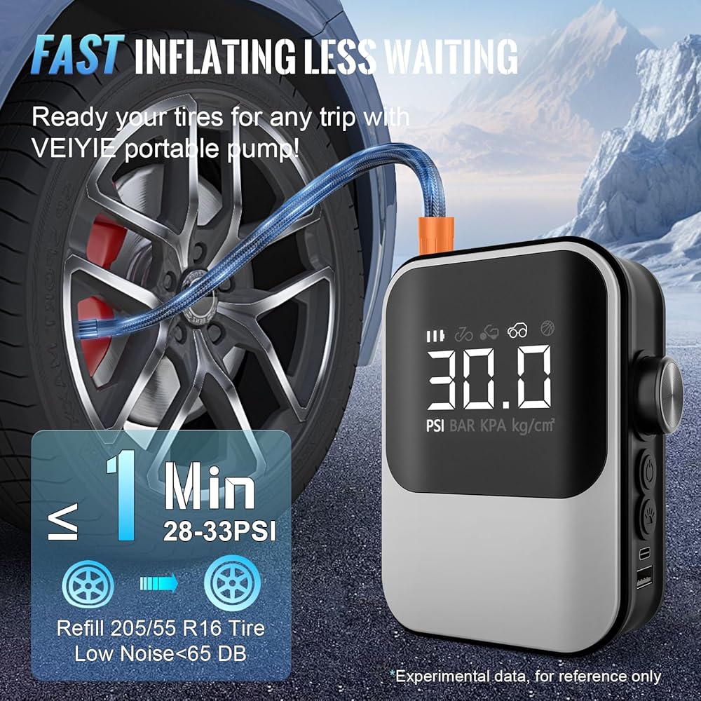 تصميم مبتكر 6 في 1 - مضخة نفخ محمولة من VEIYIE تجمع بين جهاز نفخ أوتوماتيكي لاسلكي، ومنفاخ يدوي، وإضاءة، ومقياس ضغط الإطارات، وشاشة LCD وكنز الشحن في ملحقات سيارة واحدة، مع الاهتمام بتجربة السفر الخاصة بك بطريقة شاملة. ضوء LED مناسب لك للاستخدام في البيئة الخافتة، ويوفر مقياس ضغط الإطارات الأمان لإطارات سيارتك، كما أن شاشة LCD الواضحة تجعل قراءة مستويات الضغط أمرًا سهلاً.