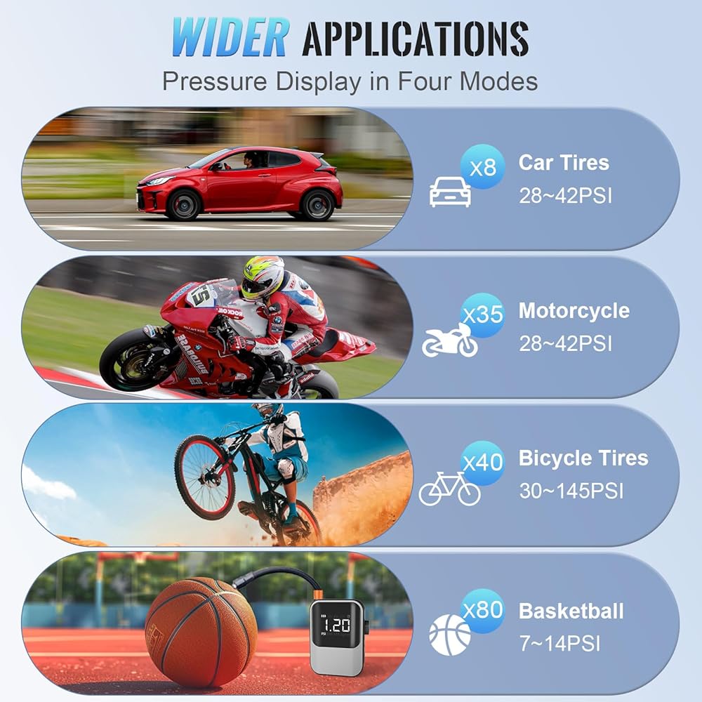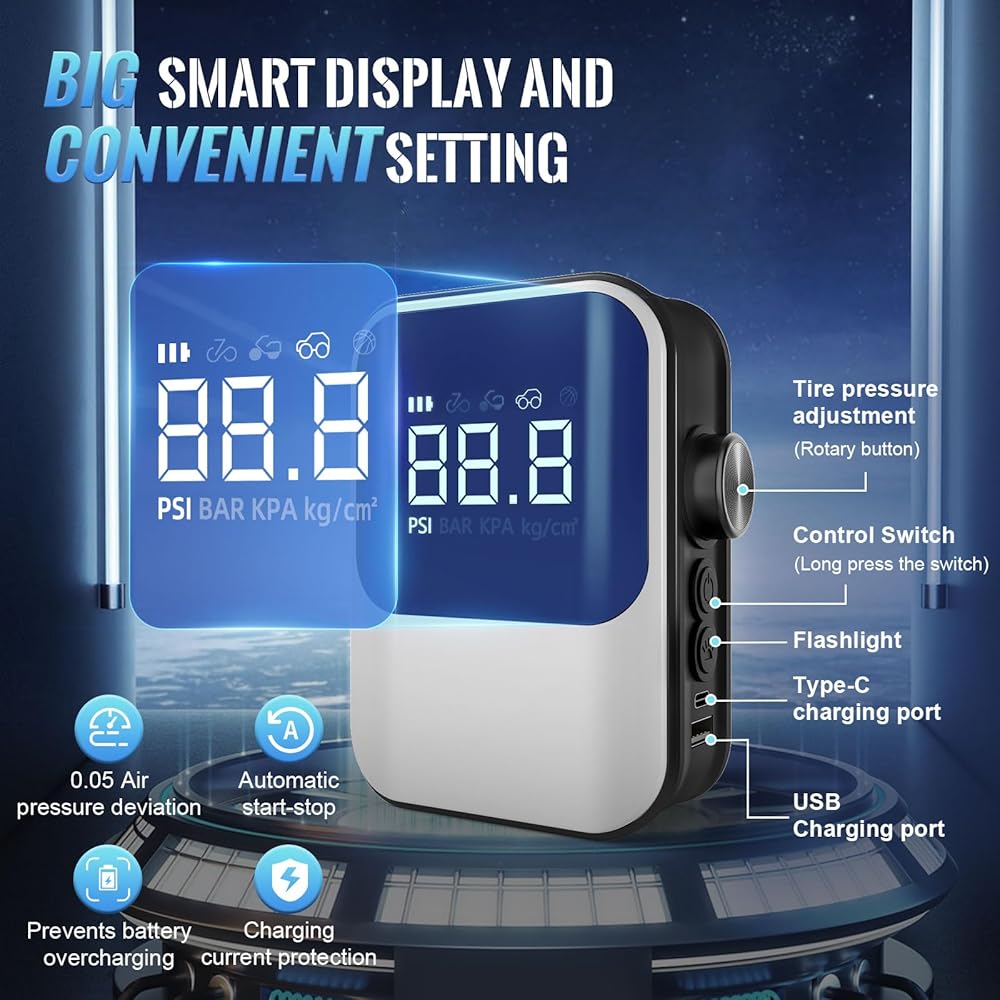 نظام ذكي مبتكر - تم تجهيز مضخة النفخ المحمولة بأحدث شريحة تحكم ذكية، ويمكن أن تكون قيمة ضغط الهواء دقيقة إلى 0.05 رطل لكل بوصة مربعة، وسوف تتوقف تلقائيًا عن النفخ عندما تكون ممتلئة، وتجنب خطر النفخ الزائد. بالإضافة إلى ذلك، تحتوي الشريحة على ضغط هواء مدمج مسبقًا لسيناريوهات مختلفة، لإطارات السيارة والدراجات النارية والدراجات وكرات السلة وما إلى ذلك، يمكنك بسهولة تبديل الأوضاع أو ضبط قيمة رطل لكل بوصة مربعة بنفسك، بسيطة ومريحة!