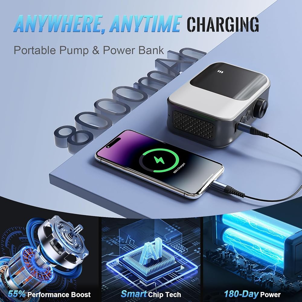 عمر طويل للغاية - تم تجهيز منفاخ الإطارات المحمول ببطارية عالية الكثافة 8000 مللي أمبير في الساعة، والتي تتمتع بعمر أطول بكثير من ضاغط الهواء للسيارة بنفس سعة البطارية الموجودة في السوق. وفي الوقت نفسه، يمكن أيضًا استخدام المضخة كبنك طاقة لتوفير عمر البطارية لأجهزتك الإلكترونية الأخرى. 365 يومًا من زمن الانتظار الطويل جدًا، مما يوفر حماية طويلة الأمد لسلامتك أثناء السفر.