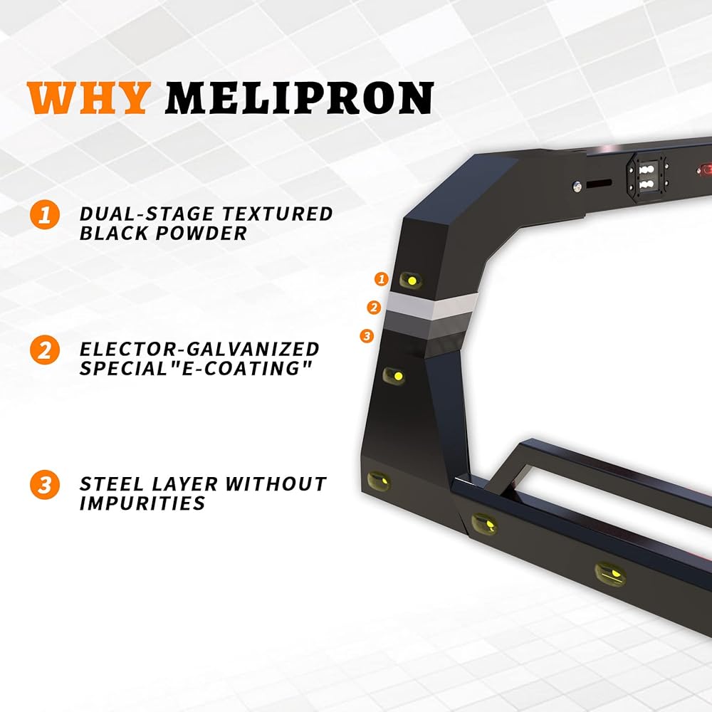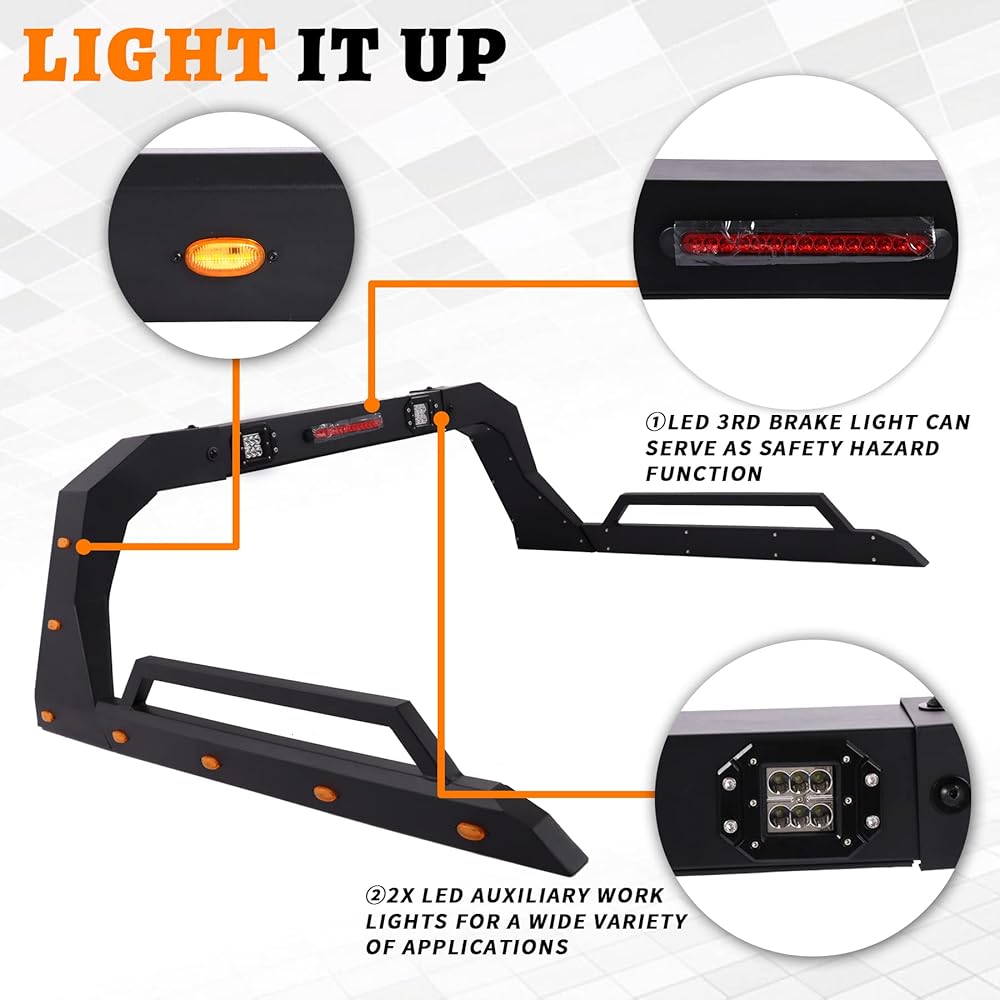 MELIPRON Universal Adjustable Truck Bed Chase Rack Roll Bar with 3rd Third Brake Light & 2X LED Work Lamps Bars & 6X Amber Side Marker