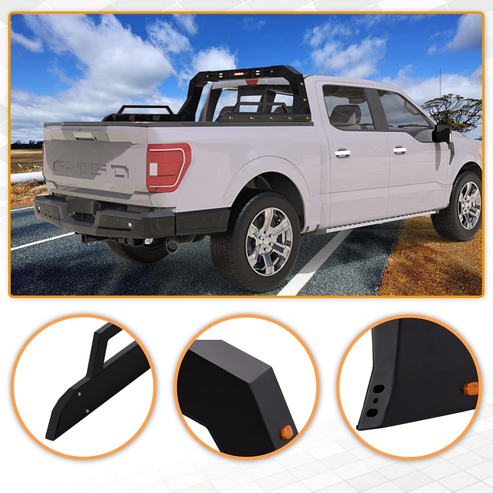 • 【Enhanced Safety】Truck bed chase rack is equipped with LED brake tail lamps, auxiliary work light bars, and side marker lamps. Served as blinkers/signals/hazard lights, effectively reducing potential safety hazards in the dark.