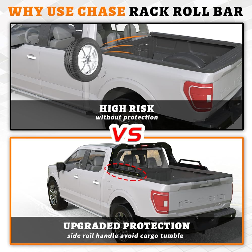 • 【Protective Function】Mounting chase rack can avoid tumbling while carrying long heavy cargo, such as lumber, ladder, etc. This roller bar and side rail tumbler will improve safety and avoid this risk.