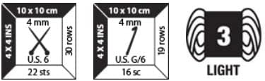 • Crochet gauge: US Size G-6 (4 mm), 16 sc x 17 rows = 4" Knit gauge in st: US Size 6 (4 mm), 22 sts x 28 rows = 4"