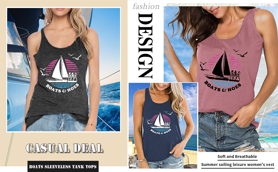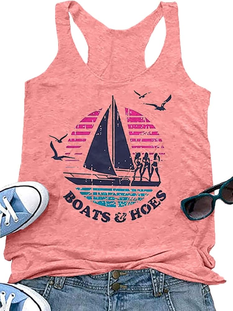 السمات: طباعة رسومات القوارب، بدون أكمام، ظهر متسابق، رقبة دائرية، مقاس فضفاض، تي شيرت مضحك لطيف،