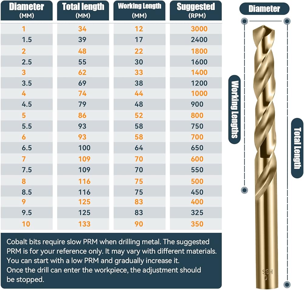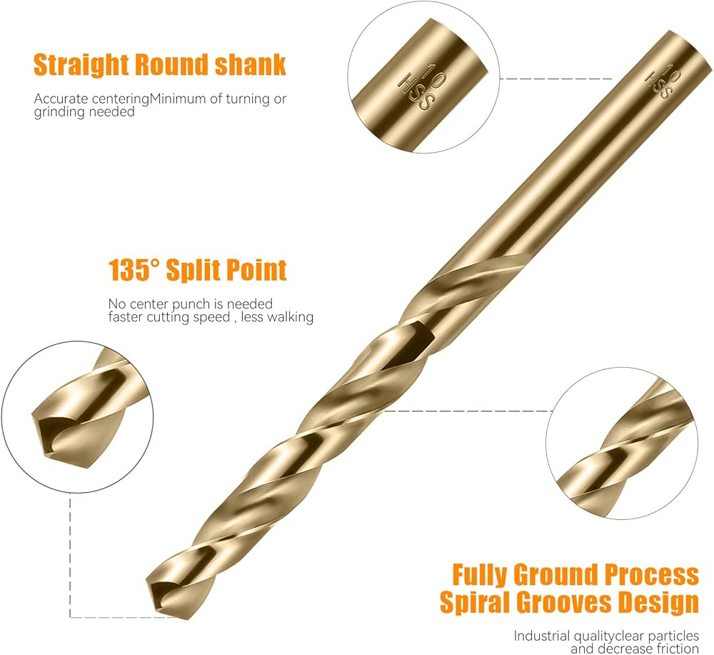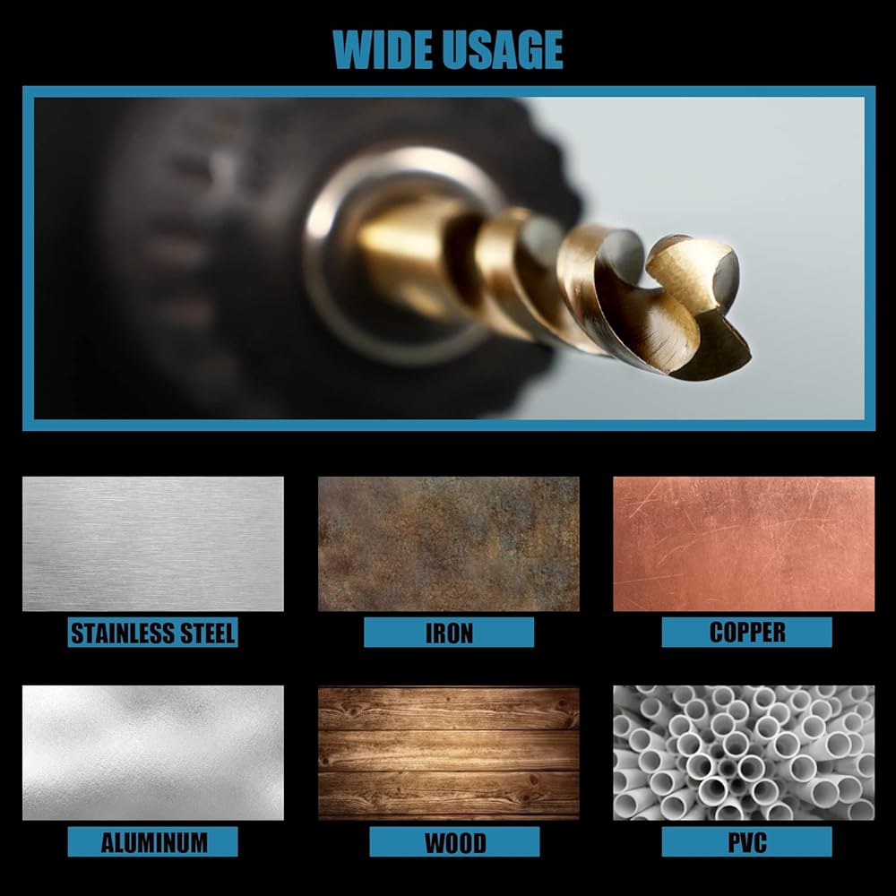 【احترافي ويستخدم على نطاق واسع】ستيل الكوبالت عالي السرعة M35 أكثر ملاءمة للمواد الصلبة. مثالية لقطع الستانلس ستيل والستيل والحديد الزهر وكذلك الخشب وسبائك الألومنيوم والمعادن الأخرى. غير مناسب للزجاج أو السيراميك. انتبه إلى السرعة والضغط والتحكم في الحرارة عند الحفر.