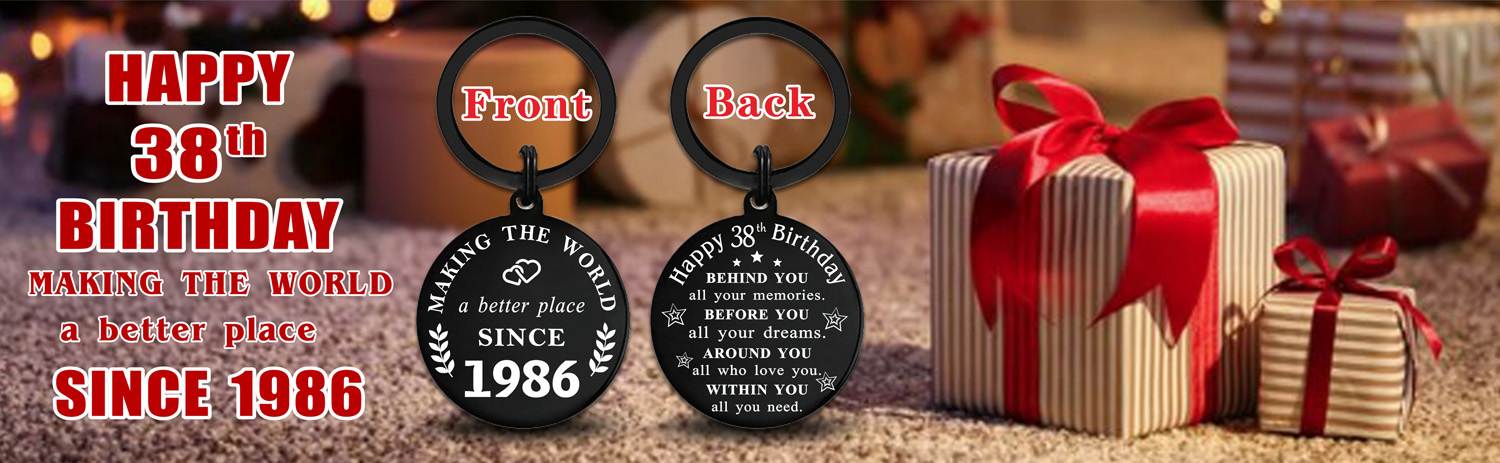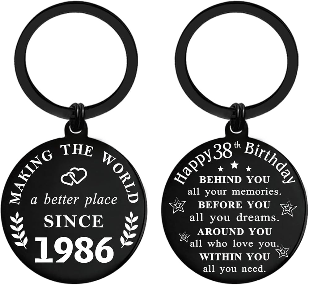 سلسلة مفاتيح لعيد الميلاد عام 1986 - الجانب الأمامي مكتوب عليه "جعل العالم مكانًا أفضل منذ عام 1986"، والجانب الخلفي مكتوب عليه "عيد ميلاد سعيد 38! خلفك، كل ذكرياتك. أمامك، كل أحلامك. حولك، كل من تحب بداخلك كل ما تحتاجه."