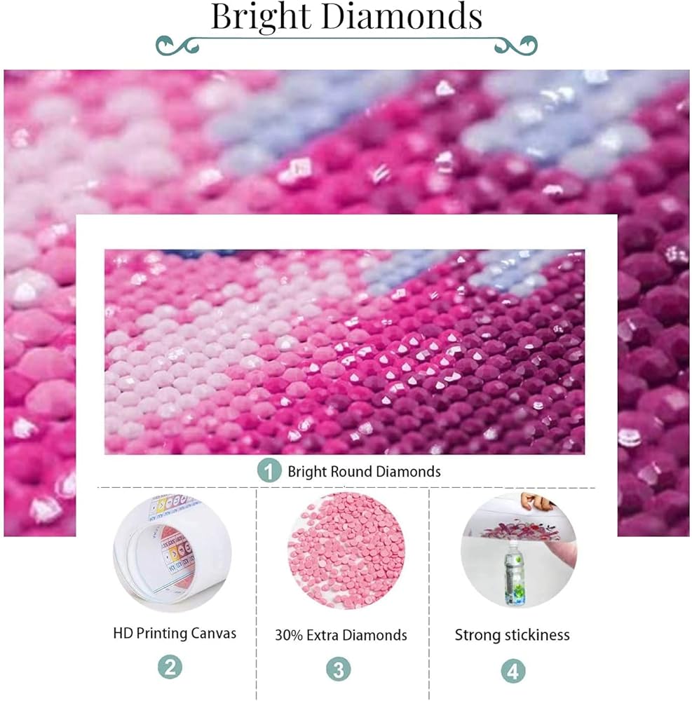 Sparkling diamonds, strong Dimensional, Perfect color match, pattern vivid image, never fade. We added 30% extra diamonds to solve the problem of losing diamonds during the production process