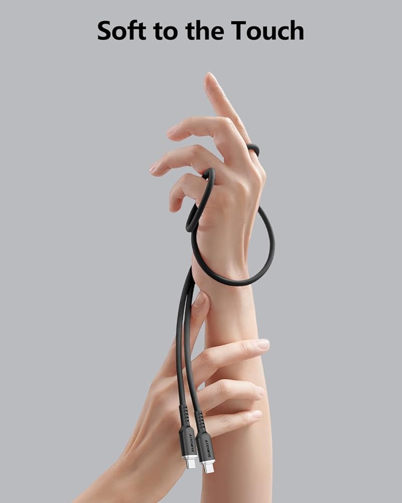 كابل SUNGUY USB-C إلى USB-C 100 وات، [عبوتان، 3.3 قدم] كابل USB 2.0 لنقل البيانات من السيليكون الناعم من النوع C، متوافق مع iPhone 15/15 Pro/15 Pro Max، Galaxy S24/S23/S22، MacBook - أسود