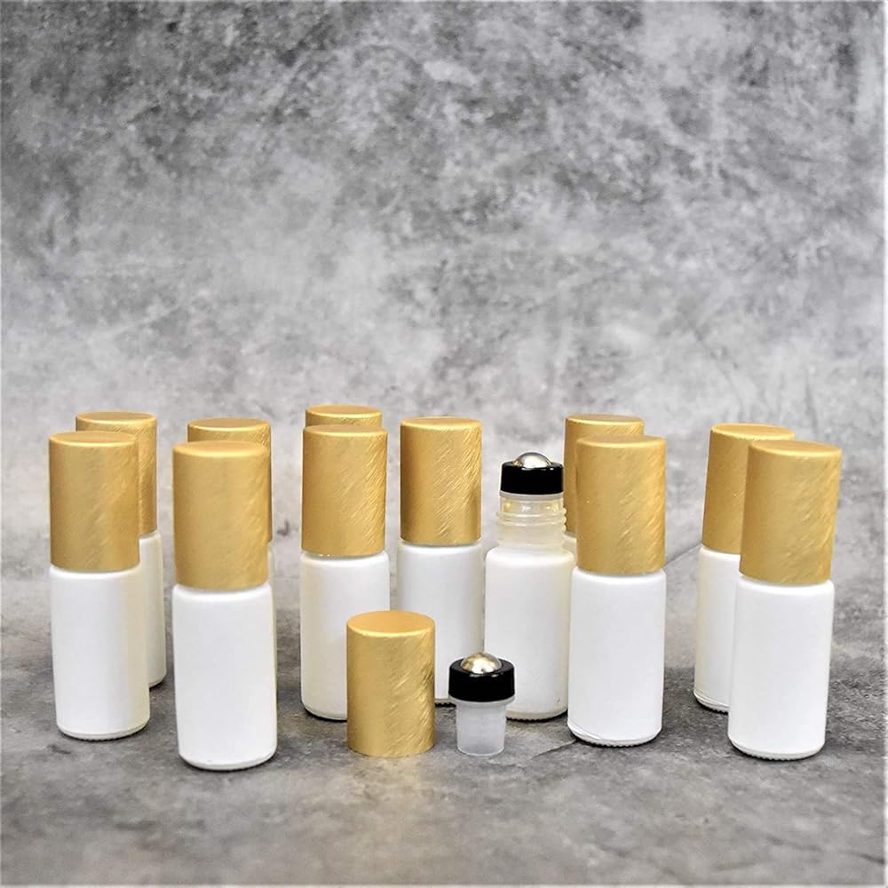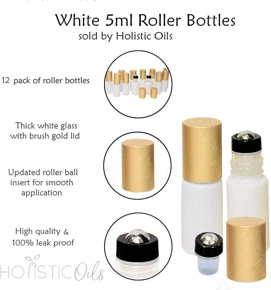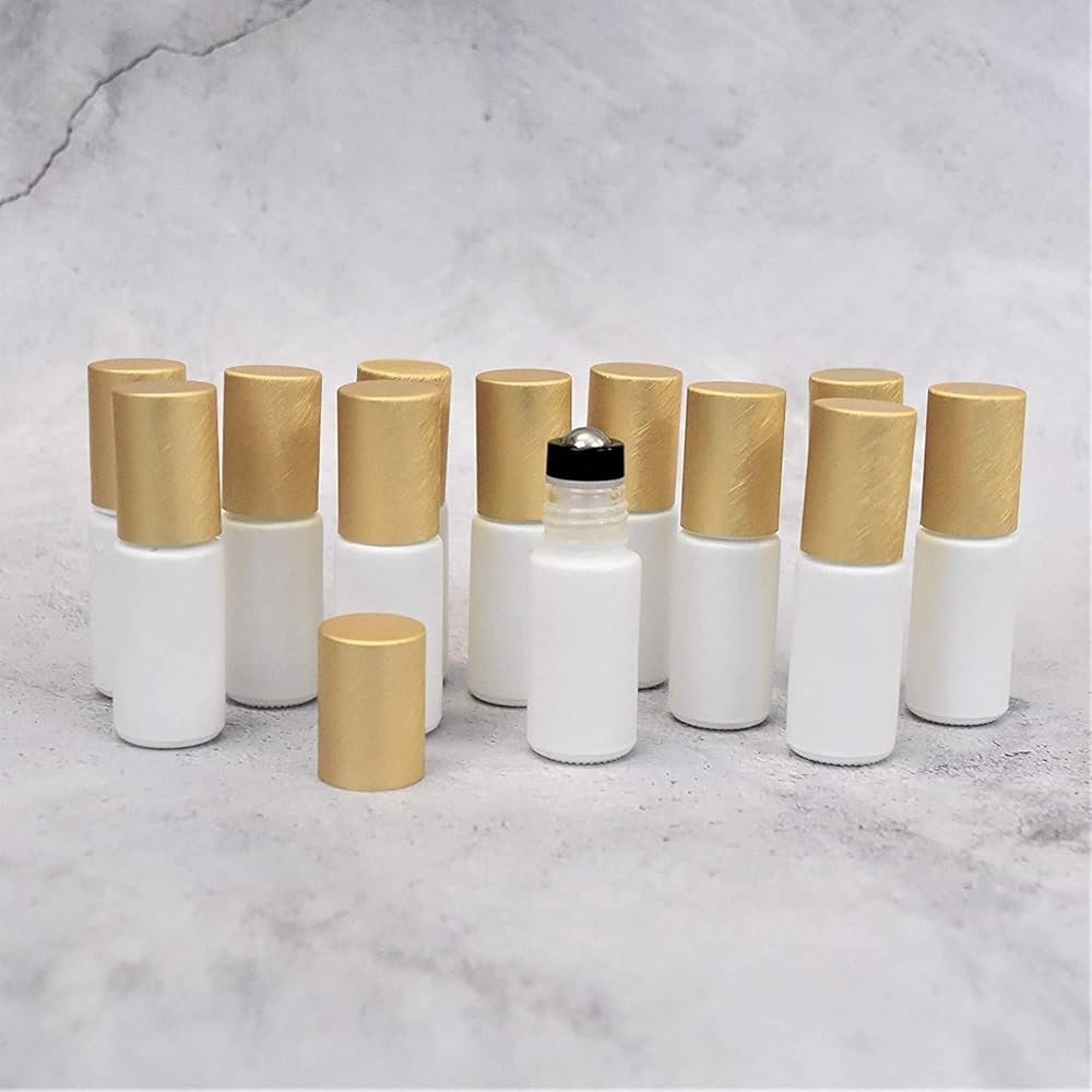 الزيوت الشاملة 12 عبوة من زجاجات الزيوت العطرية الدوارة، من الفولاذ المقاوم للصدأ - بكرات زجاجية بيضاء 5 مل، أغطية ذهبية - مجموعة فارغة مقاومة للتسرب للسفر والعطور والمزج وملمع الشفاه