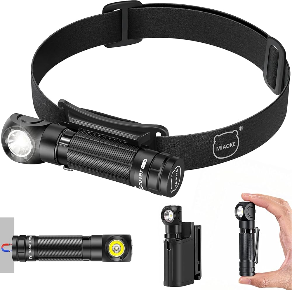 MIAOKE EDC 1000 Lumens مصباح أمامي مغناطيسي قابل لإعادة الشحن للبالغين، مع صندوق حزام ومشبك جيب ثنائي الاتجاه، 5 أوضاع إضاءة، 4 طرق للحمل، إمالة قابلة للتعديل 360 درجة، لإصلاح السيارات، الطوارئ، في الهواء الطلق