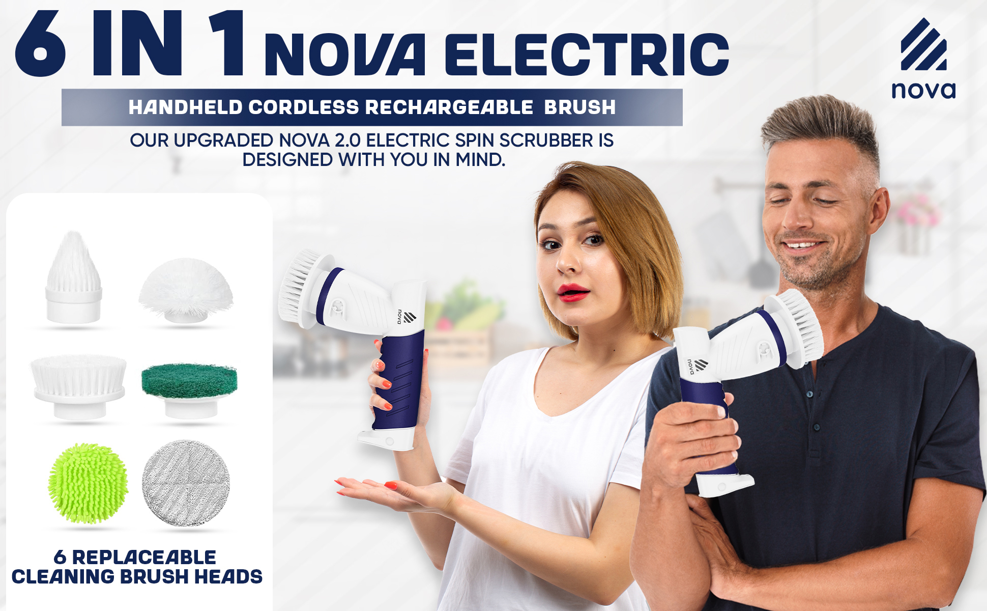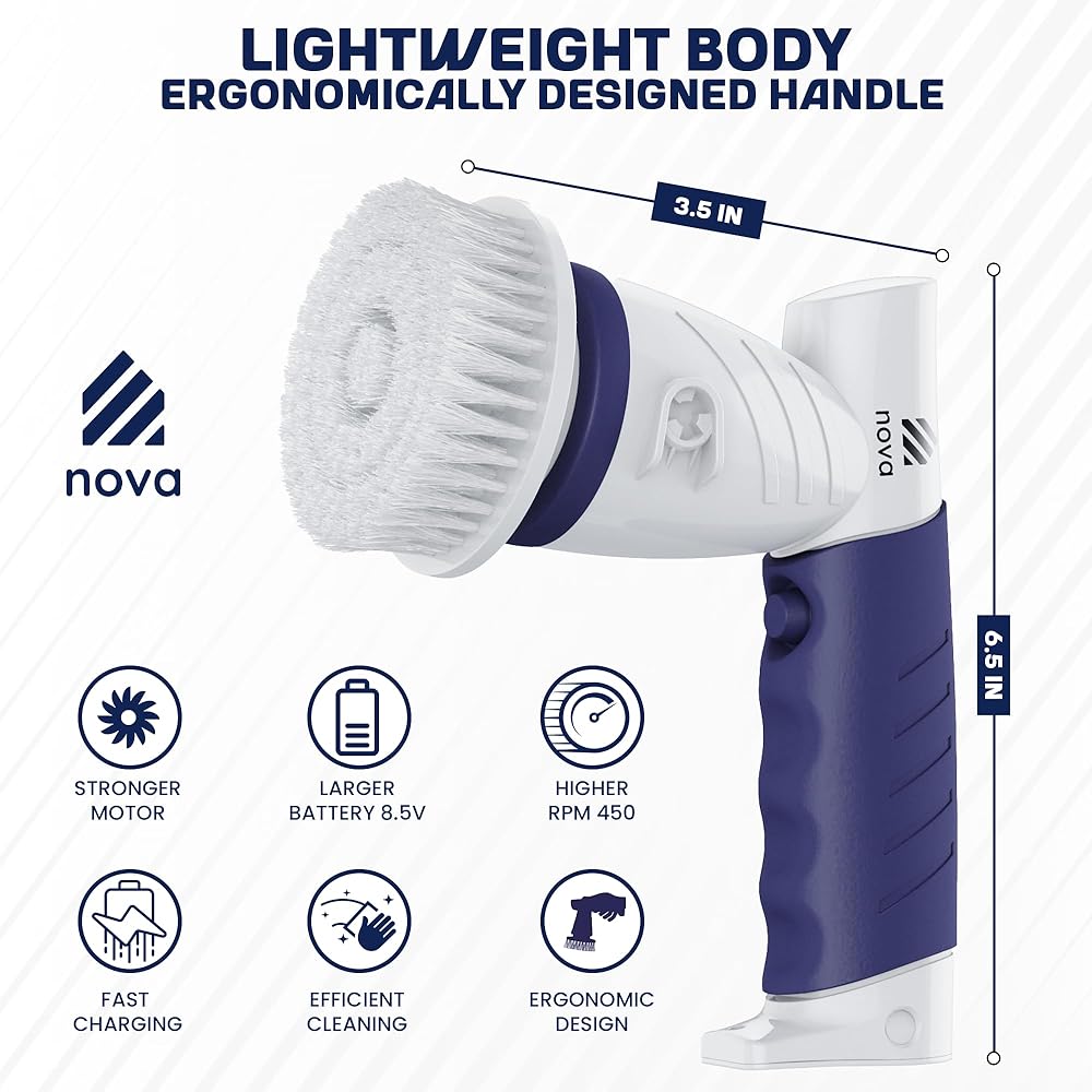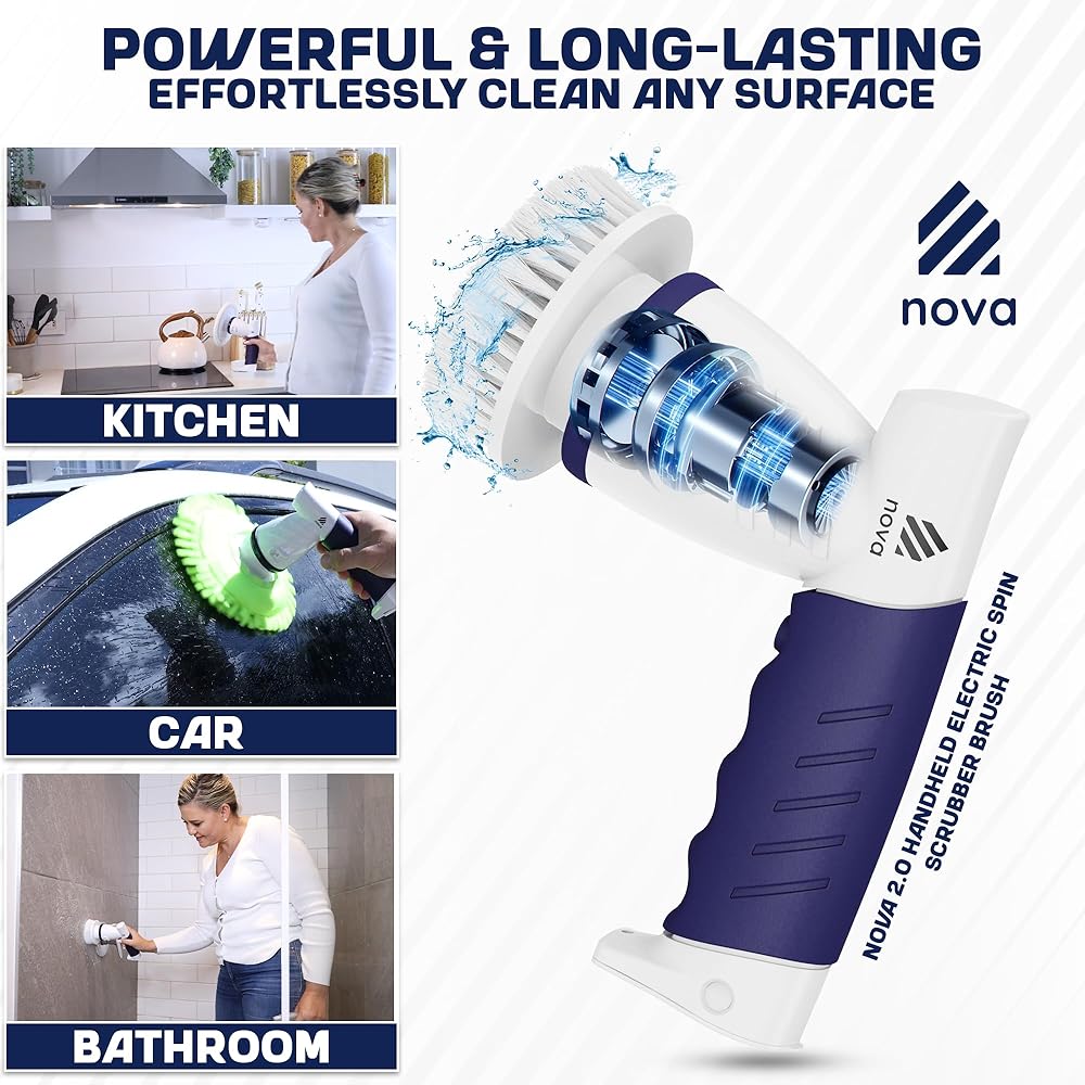 فرشاة تنظيف دوارة كهربائية من نوفا 2.0، فرشاة دوارة للحمام قابلة لإعادة الشحن لاسلكية محمولة لتنظيف الحوض/البلاط/الأرضية/الحوض/النافذة | محرك أقوى وبطارية أطول مع 6 رؤوس فرشاة تنظيف قابلة للاستبدال