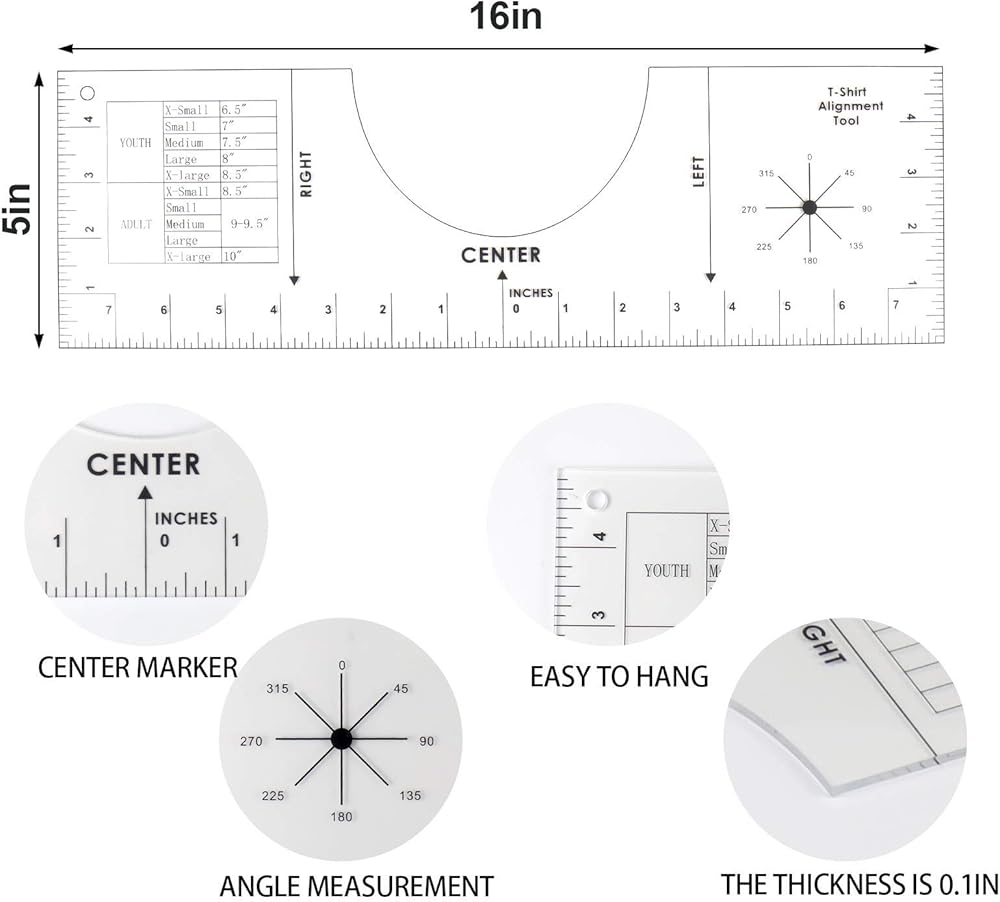 Description: Our tshirt guide ruler made of high-qualitily acrylic, other material are more prone to breaking. It can help you to make center alignments and save your valuable time.This Ruler is clearly marked and easy to carry on. when you want to design your T-Shirt, this T-Shirt design tool is a huge help, Simple design makes it easy to use. The round hole design of the shirt ruler makes it easy to Storage.