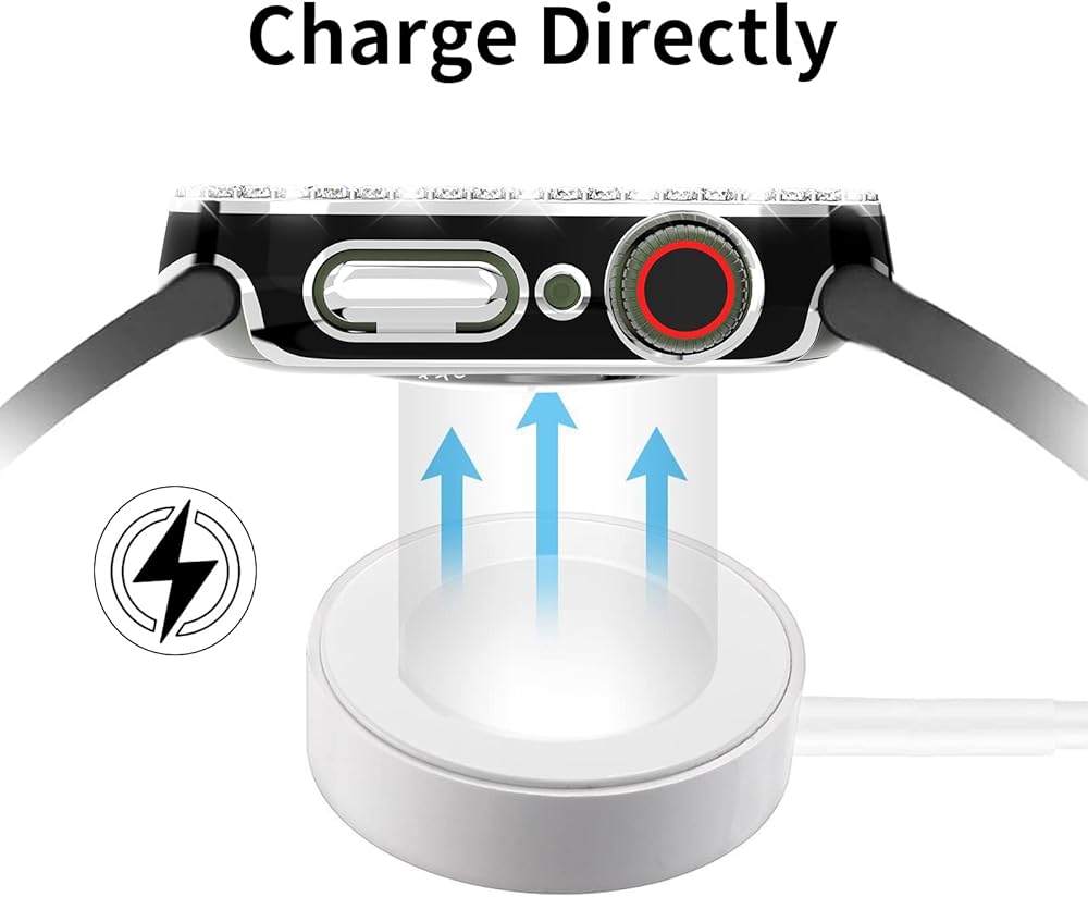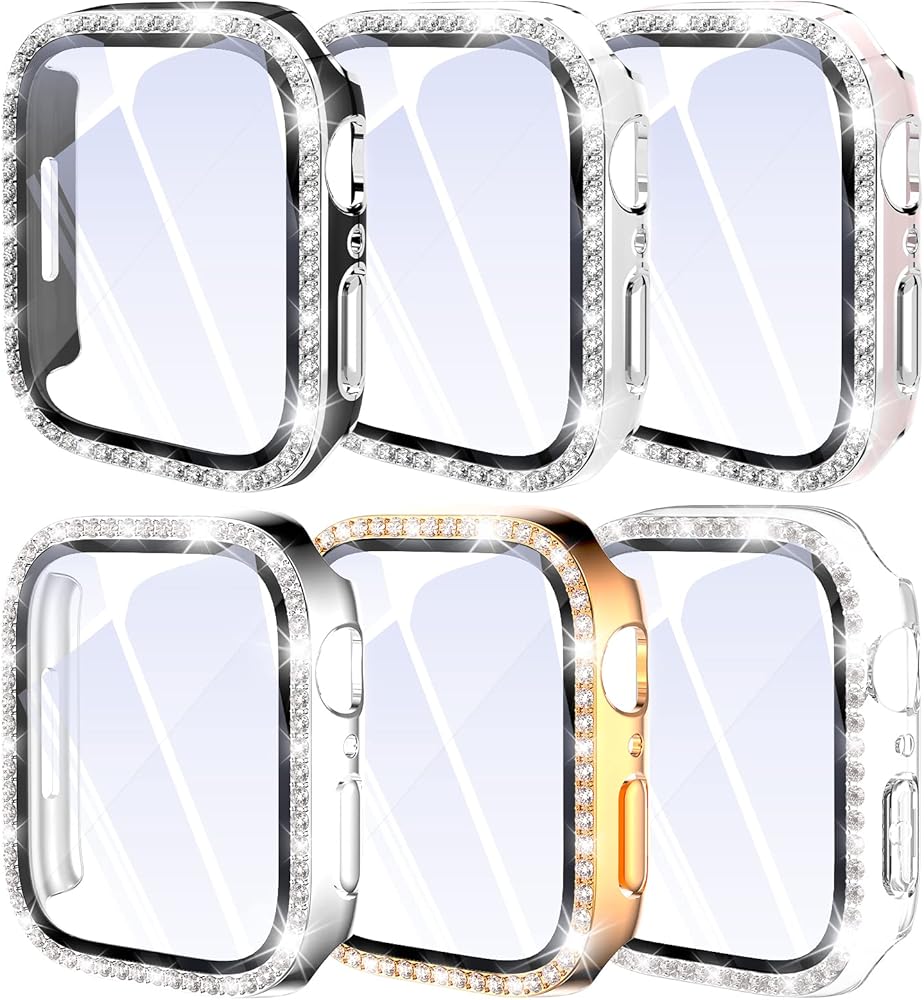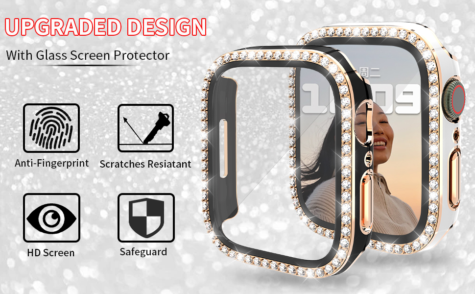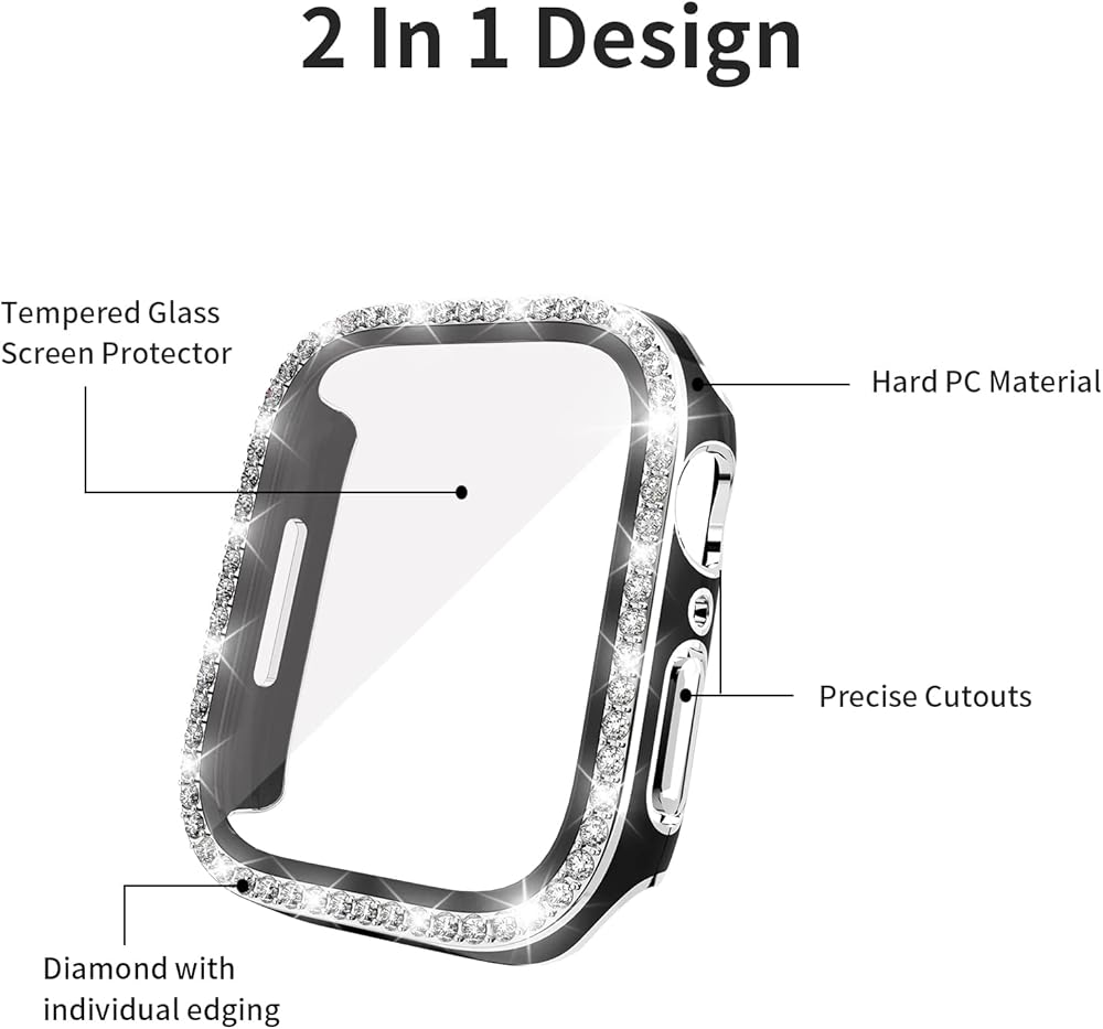 المواد: مصنوعة من البولي كربونات الصلب عالي الجودة. عملية الطلاء مع زخارف حجر الراين اللامع، رفيعة وخفيفة الوزن مع تجربة ارتداء مريحة، لا يتغير شكلها أو يتغير لونها. شاشة الزجاج المقسى رفيعة وواضحة بشفافية بنسبة 99.99%، وتعد بحساسية جيدة لشاشة اللمس. توفر المادة المتينة حماية كاملة للحواف لسلسلة iWatch 8/7 ضد الخدوش والصدمات، وتوفر حماية أفضل