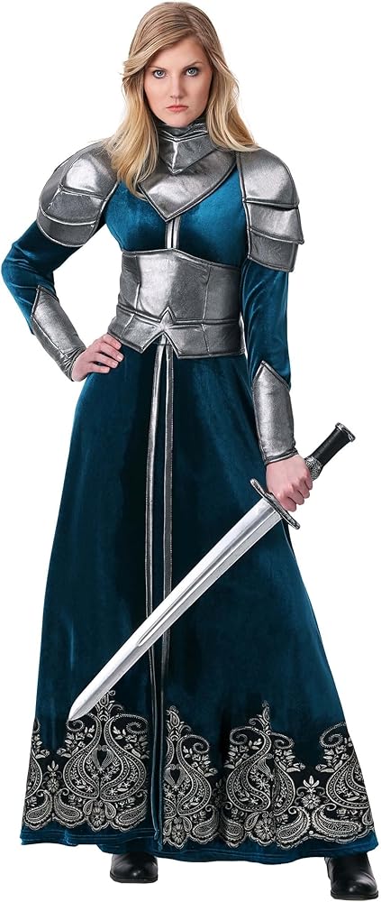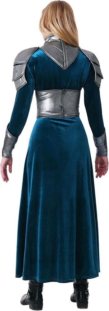 Balance elegance with competence when you choose this women's Medieval warrior costume for your next costume party! The soft dark blue fabric is balanced with foam armor on the shoulders, waist, and wrists. The armor is lightweight and flexible with a metallic finish, letting you remain comfortable and wear this ensemble again and again. Whether you're in the throne room or on the battlefield, you're sure to come out on top in this dramatic ensemble! - Dress - Body Armor - Shoulder Armor - Pair of Gauntlets