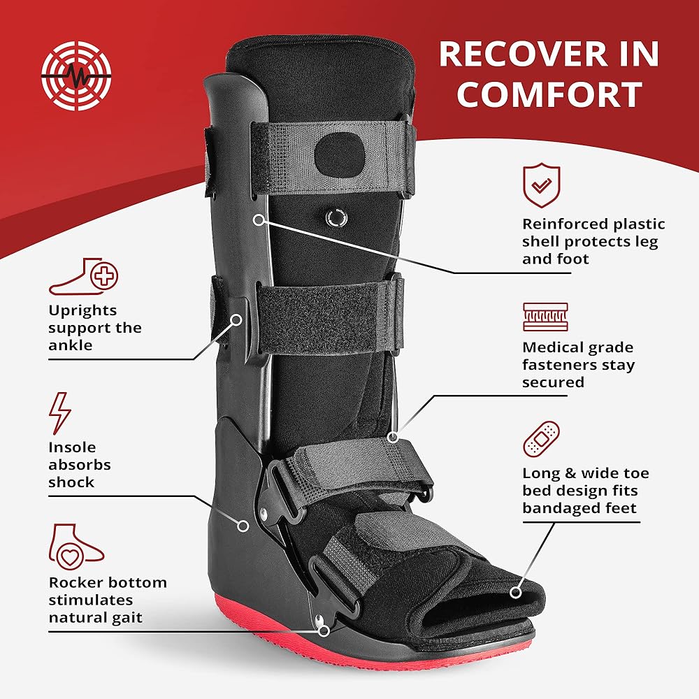 يحفز المشية الطبيعية: تم تصميم حذاء المشي CAM الخاص بنا بقاعدة قدم هزازة تسمح لك بالمشي بشكل طبيعي بأقل حجم. يمتص النعل الداخلي المبطن الصدمات لمنع التعب بينما تعمل البطانة المصبوبة على تعزيز حركة الكاحل بشكل مناسب لمنع المزيد من الإصابات أثناء الشفاء.