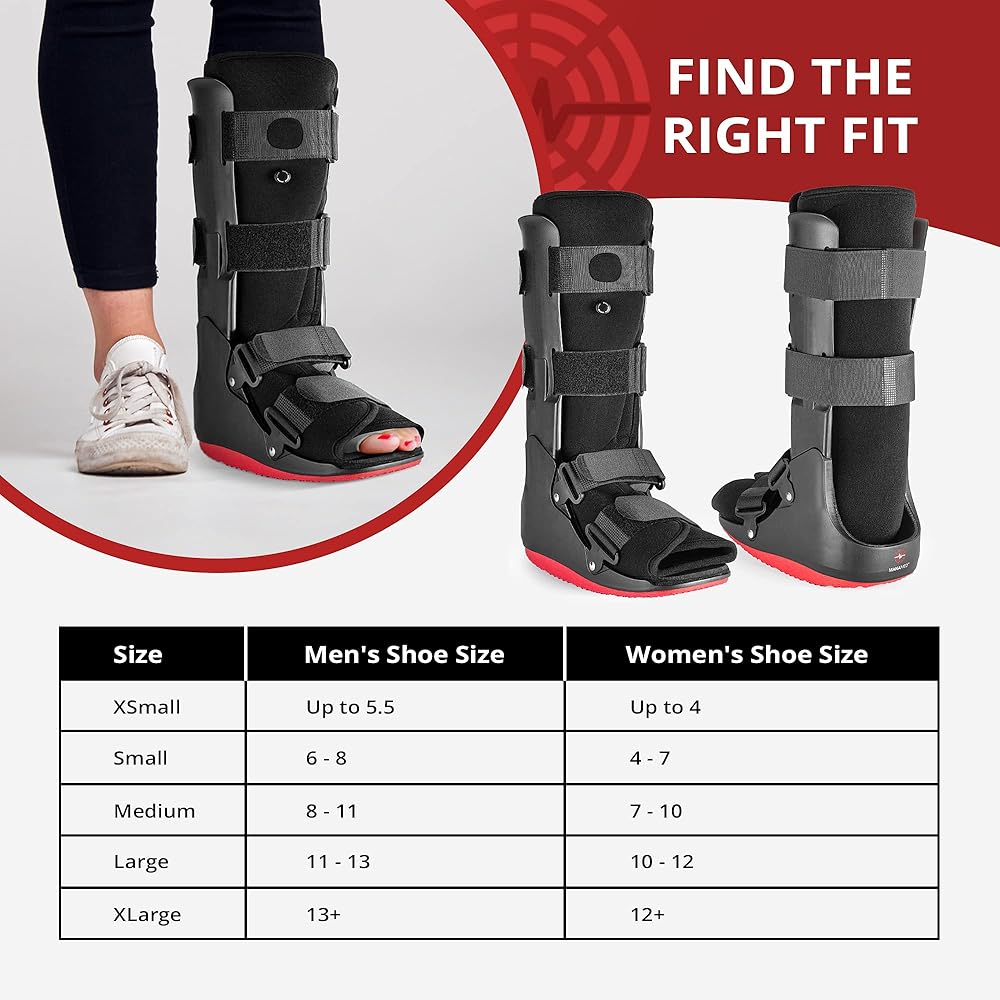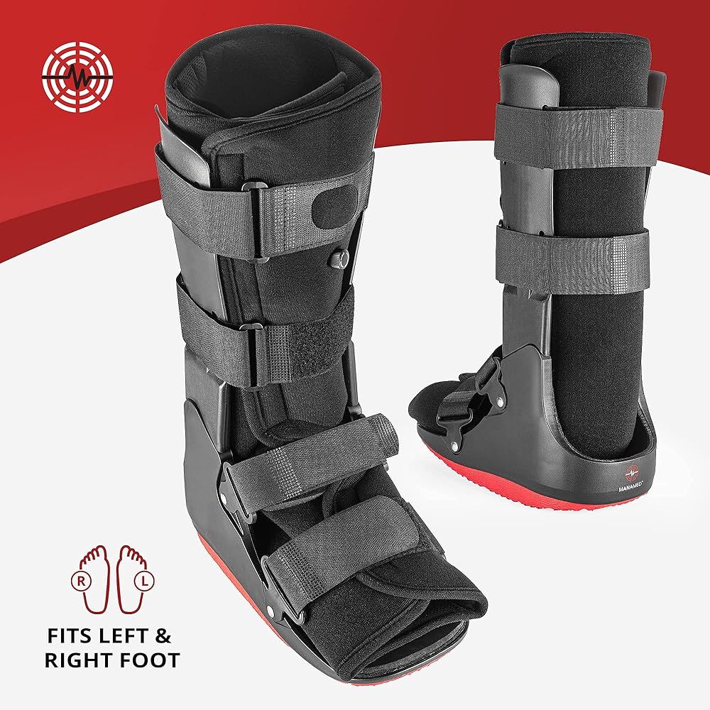 حذاء عالمي للقدم: يمكن ارتداء حذاء ManaEZ Boot Air cast للقدم على القدم اليسرى واليمنى. للحصول على أقصى درجات الراحة أثناء التعافي، يتميز كل حذاء من أحذية Aircast أيضًا بتصميم سرير طويل وواسع عند الأصابع. هناك مساحة كبيرة للقدم ذات الضمادات أو المتورمة، مما يجعله الحذاء المثالي بعد العمليات الجراحية.