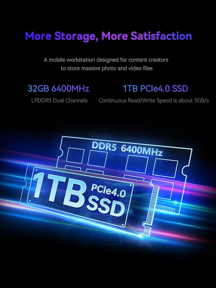 🔥【تخزين وذاكرة فائقة السرعة】: يحتوي الكمبيوتر اللوحي V3 على محرك أقراص PCIe 4.0 SSD مدمج بسعة 1 تيرابايت لسرعات نقل البيانات فائقة السرعة، وهو مجهز بذاكرة LPDDR5 بسرعة 6400 ميجاهرتز، مما يضمن سلاسة المهام المتعددة وتحميل التطبيقات بسرعة، مما يعزز كفاءة العمل.