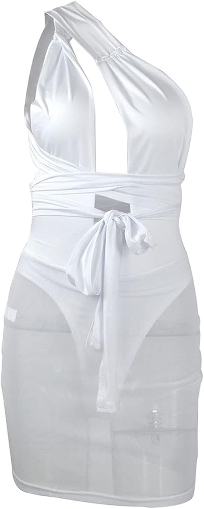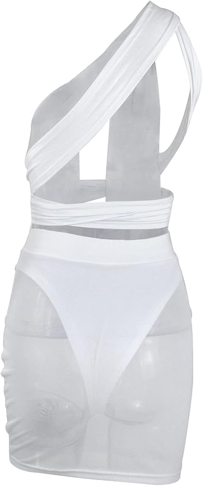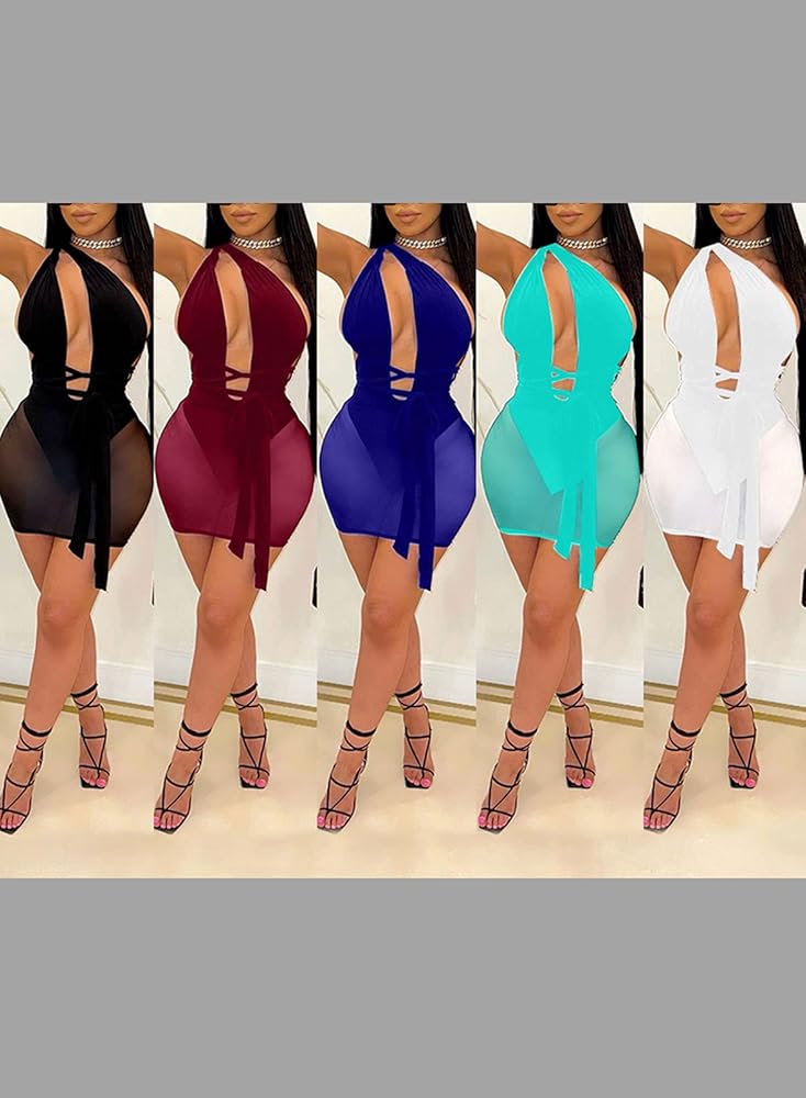 ميزات أنيقة: فستان قصير ضيق شبكي شفاف، شفاف، بدون أكمام، كتف واحد، بدون ظهر، مجوف، تصميم ضمادة بأربطة. تصميم اللف يناسب منحنيات جسمك تمامًا.