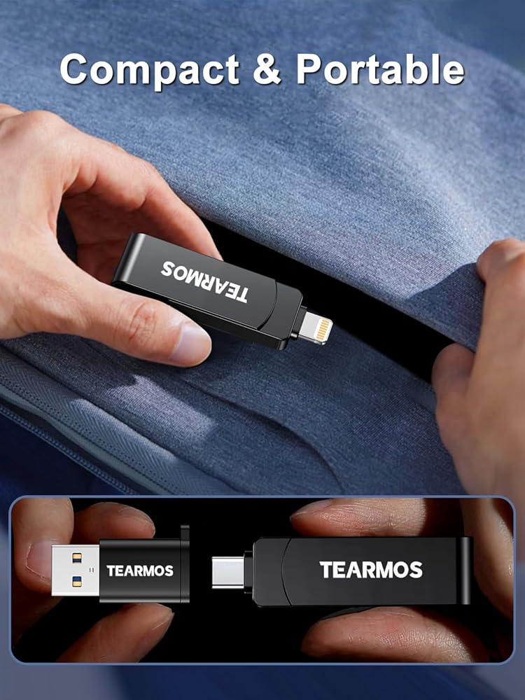 قم بتحرير مساحة ذاكرة iPhone وiPad على الفور: إذا كان جهاز iPhone أو iPad الخاص بك قد استخدم تقريبًا كل مساحة الذاكرة، فإن محرك أقراص فلاش USB هذا يمكن أن يساعد في تخفيف مساحة التخزين البالغة 128 جيجابايت. سواء كنت ترغب في تصوير مقاطع فيديو قصيرة أو التقاط صور سيلفي، فإن شريحة ذاكرة iPhone الخاصة بنا مثالية لك. ليس عليك أن تدفع مبلغًا إضافيًا للحصول على مساحة تخزين إضافية، فقط قم بتوصيل مساحة التخزين الخارجية لجهاز iPhone الخاص بك. استمتع بالمساحة الإضافية البالغة 128 جيجابايت لمحرك أقراص فلاش iphone.