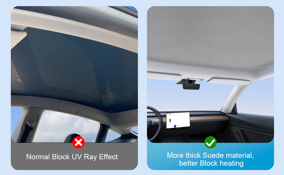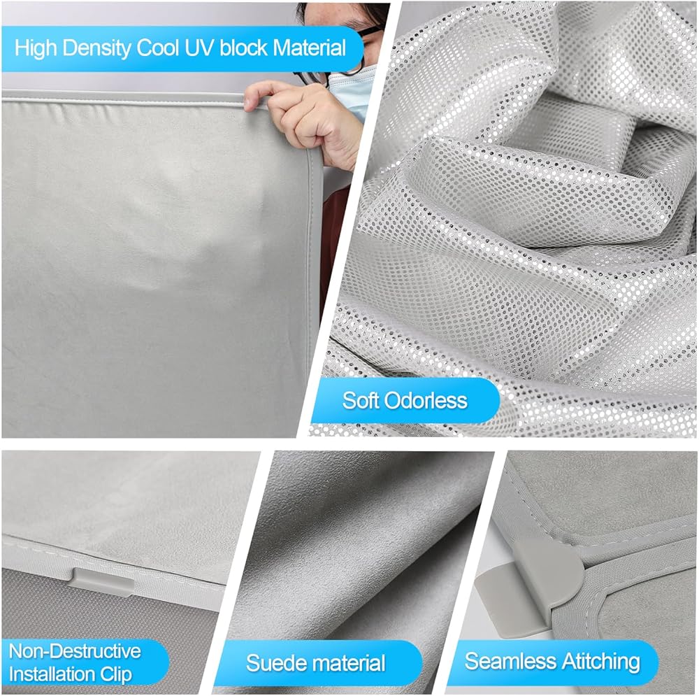 • سهلة التركيب: عند تثبيت مظلة الشمس موديل Y، قم أولاً بوضع التثبيت الصحيح للمشابك. ثم قم بتثبيت المشبك على ستارة المظلة. وأخيرًا، أدخل المشبك في الفجوة الموجودة على الحافة. يرجى ملاحظة ما يلي: يتم تثبيت الجانب الذي يحمل علامة "الأمامي" على النصف الأمامي من فتحة السقف، ويتم تثبيت الجانب الذي يحمل علامة "الخلفي" على النصف الخلفي من فتحة السقف. السطح العاكس للأشعة فوق البنفسجية من الجانب لأعلى، والسطح الأسود من الجانب إلى الأسفل.