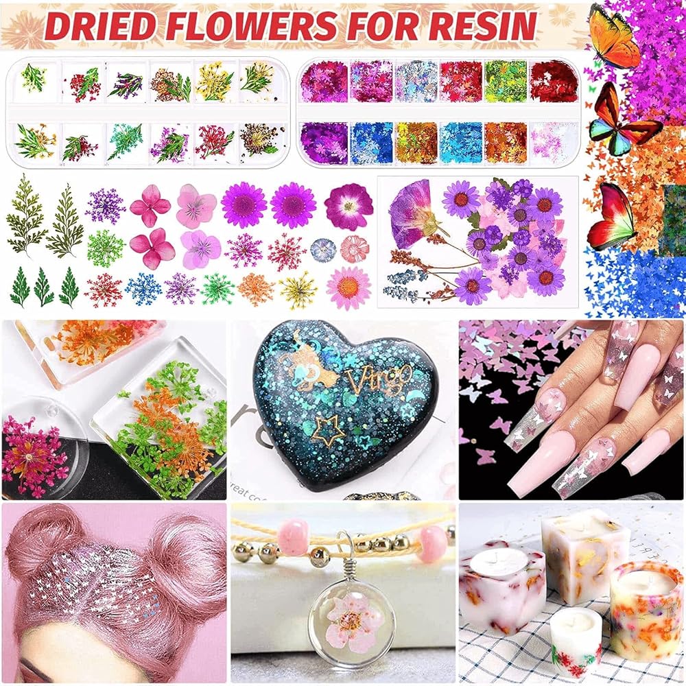 مجموعة إكسسوارات تزيين الراتنج، إكسسوارات ماكانتي من الراتنج، مستلزمات صناعة المجوهرات مع صبغ ملون من الراتنج، مسحوق ميكا لامع، زهور مجففة لقوالب صب مجوهرات الراتنج