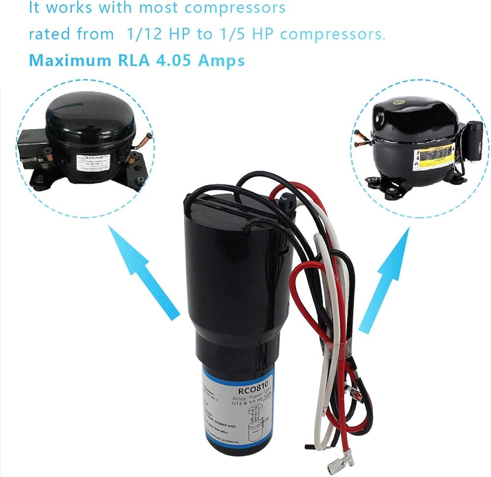 It works with most compressors rated from 1/12 HP to 1/5 HP compressors. Maximum RLA 4.05 Amps.