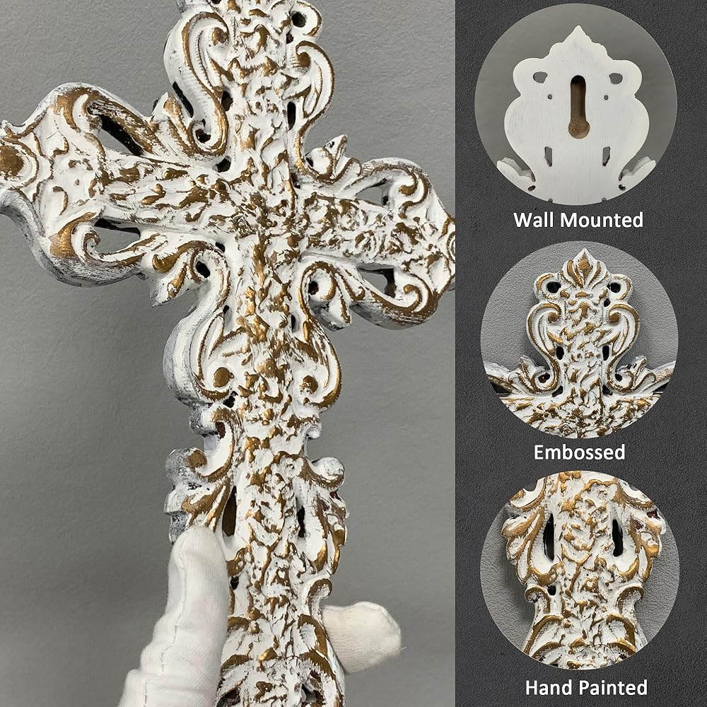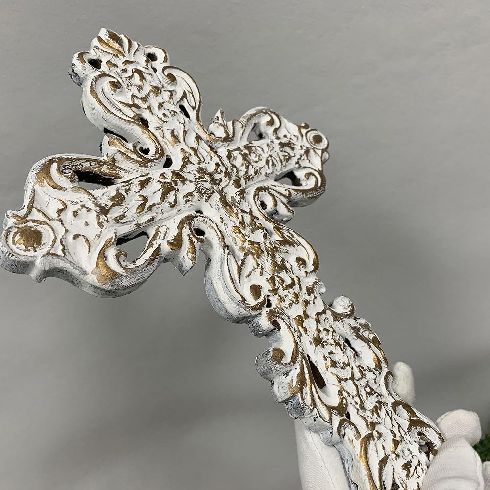 صليب حائط خشبي كبير منحوت ثلاثي الأبعاد مقاس 30.48 سم، صليب ديني عتيق مطلي يدويًا لديكور المنزل المسيحي والصلاة، هدية معمودية فريدة من نوعها (الذهب الأبيض العتيق)