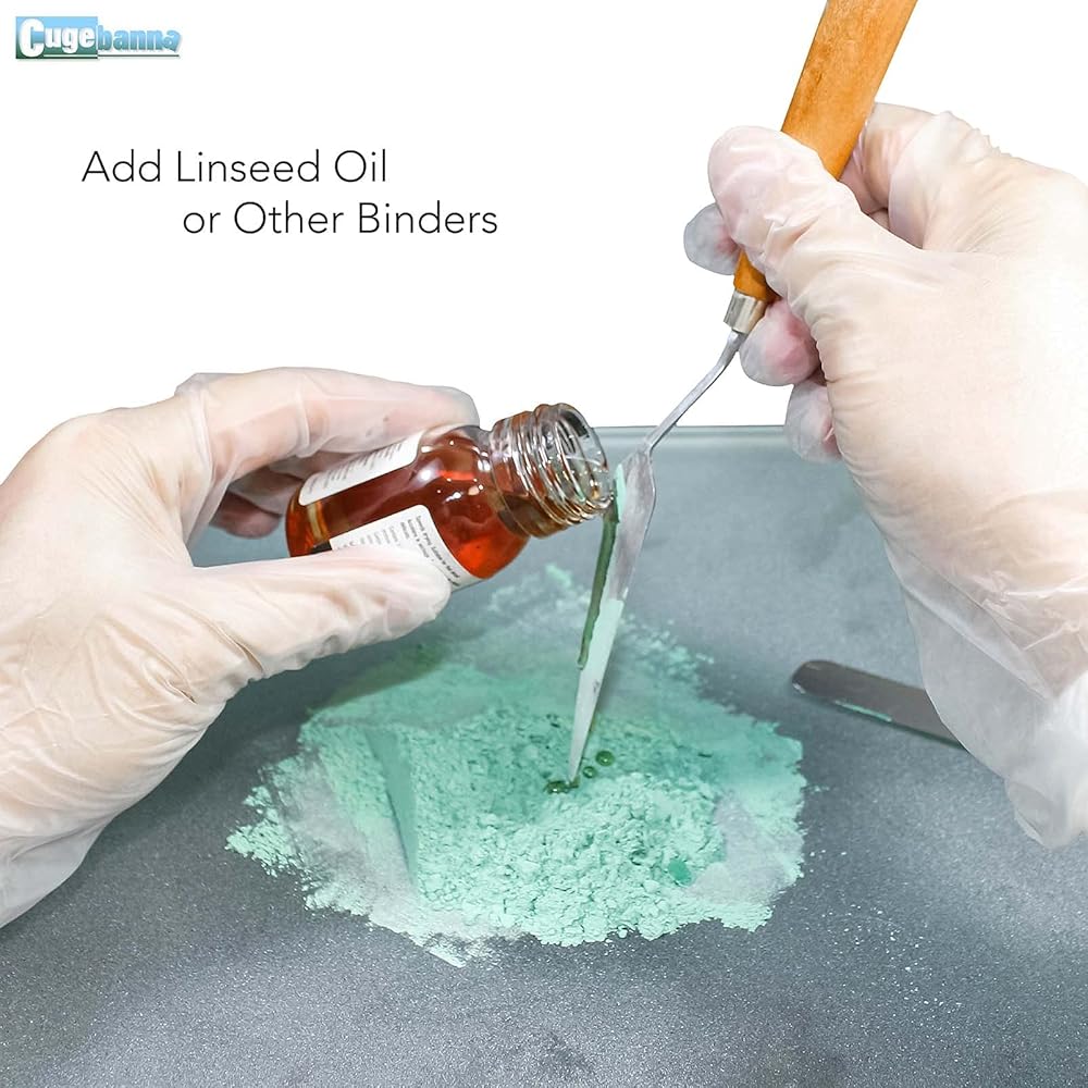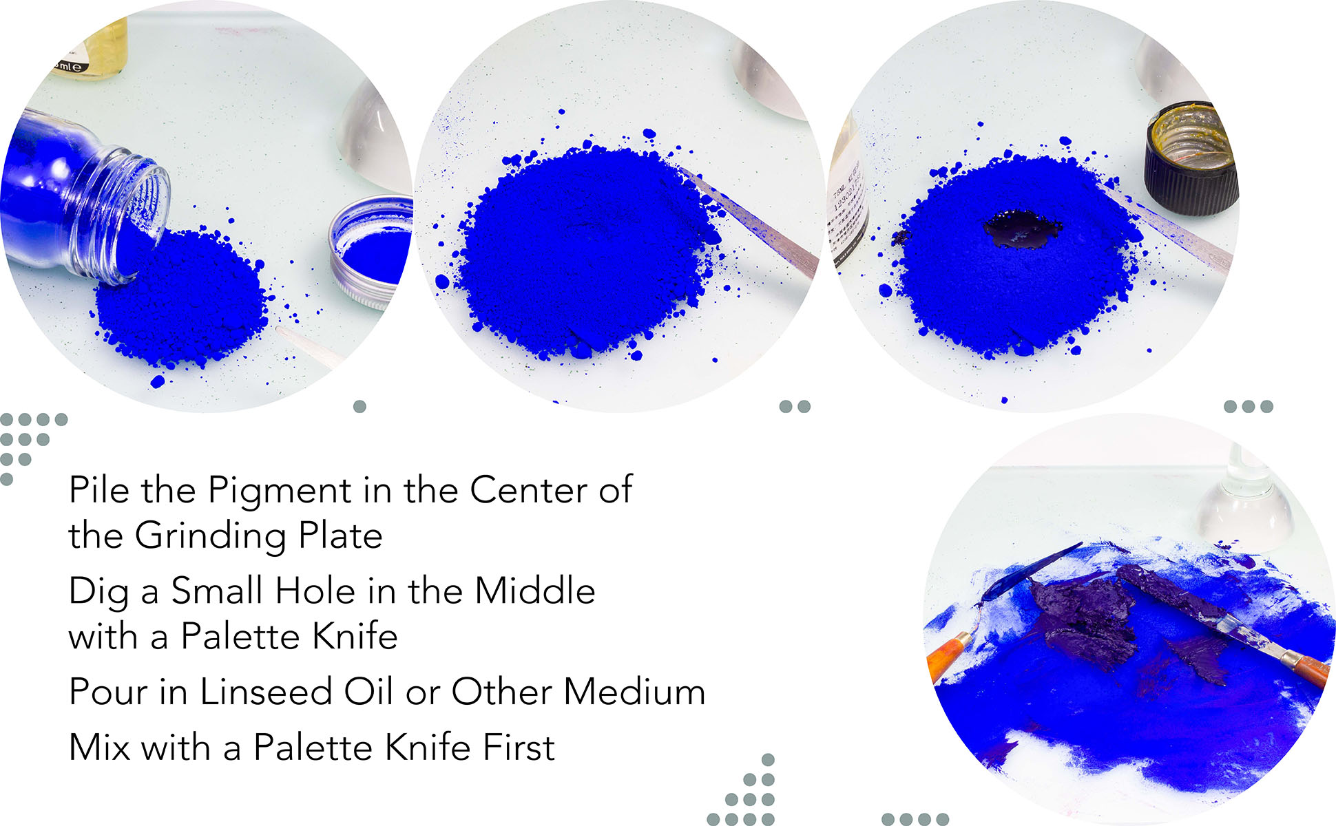 قبل كل استخدام، ضع كمية مناسبة من الصبغة المعدنية الطبيعية في وسط لوحة الطحن، واحفر ثقبًا صغيرًا في منتصف كومة الصبغة بسكين لوح الألوان، ثم أضف كمية مناسبة من زيت بذر الكتان المعصور على البارد أو أي زيت آخر. الوسائط ———— احرص على عدم إضافة الكثير في وقت واحد لتجنب أن يكون الطلاء رقيقًا جدًا. بعد الخلط الأولي بسكين اللوحة، استخدم مولر الطلاء للطحن على شكل دائرة أو شكل "8" حتى تصل إلى الصبغة المخصصة التي تحتاجها.