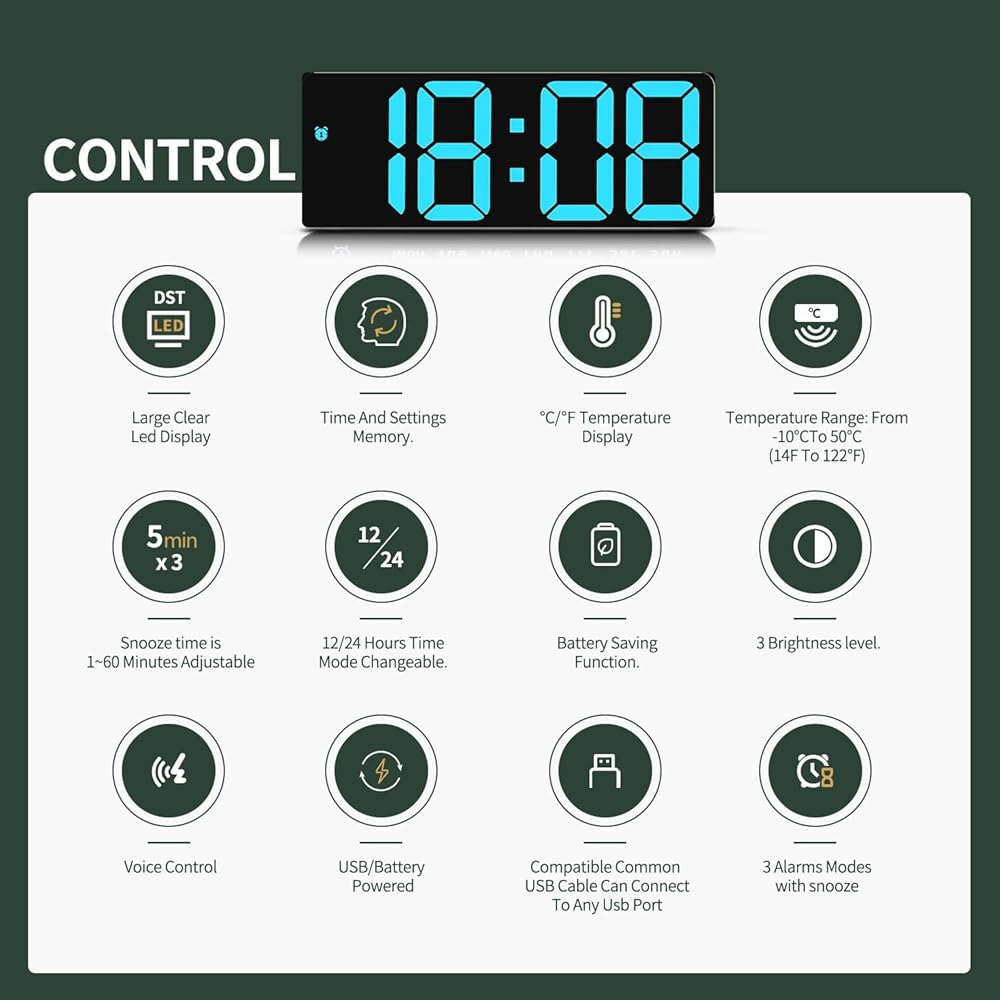 09/10) Voice Control: If The LED Clocks for Bedrooms are Only Powered by Batteries, the LED Display Can be Activated by Clapping Hands, Rapping the Table, Touching the Clock Body, and will be Turned Off Automatically After 16 Seconds, So The Small Digital Alarm Clock Bed Clock Bedroom Is Saving Power.