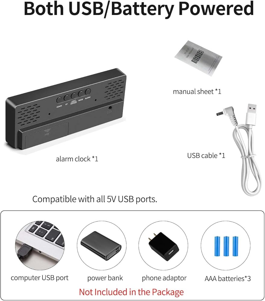 03/10) Both USB/Battery Powered: This LED alarm clock, A Small Alarm Clock for Bedside Has a Compatible Common USB cable, So It Can Use Any USB Power, Such As a Cell Phone Adaptor, Or Computer USB Port. 3 AAA Batteries (Excluded) Are Convenient Power for Travel, And They Are a Must For Saving Time Settings. But for Constant LED Display, Pls Use USB Power Always. They Are Electric Alarm Clocks For Bedrooms.