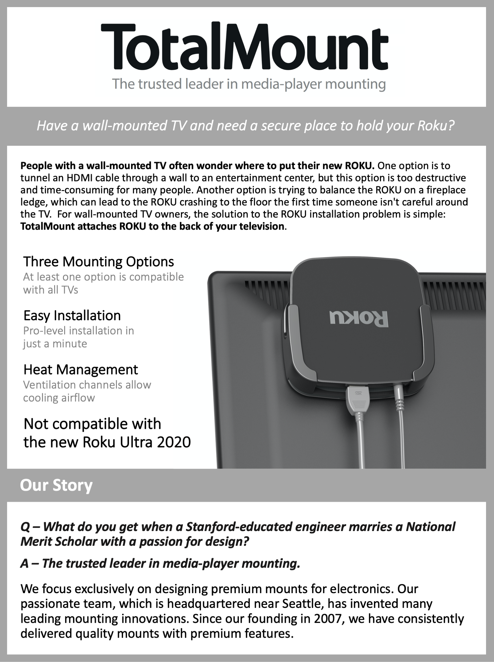 TOTAL MOUNT هي الشركة الرائدة الموثوقة في مجال تركيب مشغلات الوسائط. مع فريق متحمس يقع مقره الرئيسي بالقرب من سياتل، وأكثر من 40 براءة اختراع، وتاريخ طويل من الجودة منذ تأسيسها في عام 2007، توفر TOTAL MOUNT باستمرار الموثوقية والميزات المتميزة.