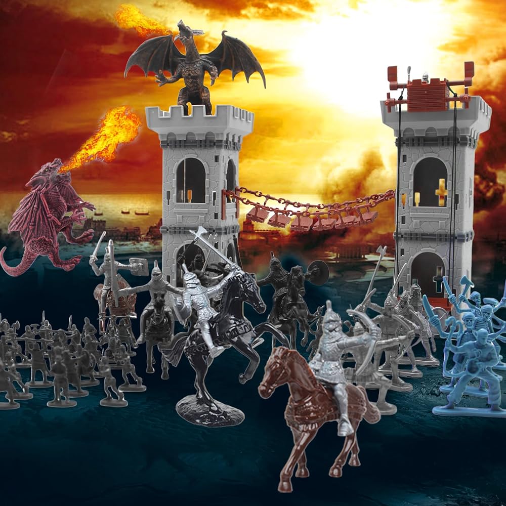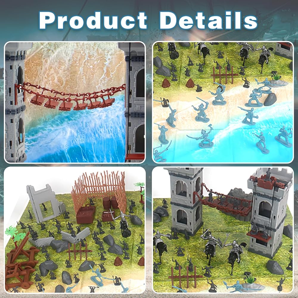 • [Package Included] This medieval knight toy include 12 Soldiers in silver,20 Pirates in blue,8 knights, 8 horses, 100 mini soldiers in gray, 1 map, 2 trees, 6 fence, 2 dragons,1 ruins, 20 stones, 2 flags, sentry post,arrow Tower,accessories for drawbridge. Army men figures with weapon are in various poses and style.