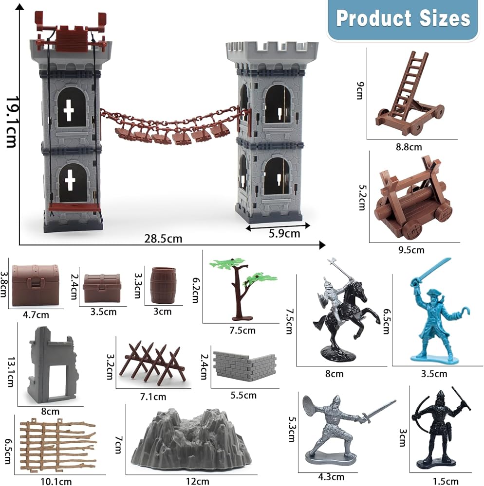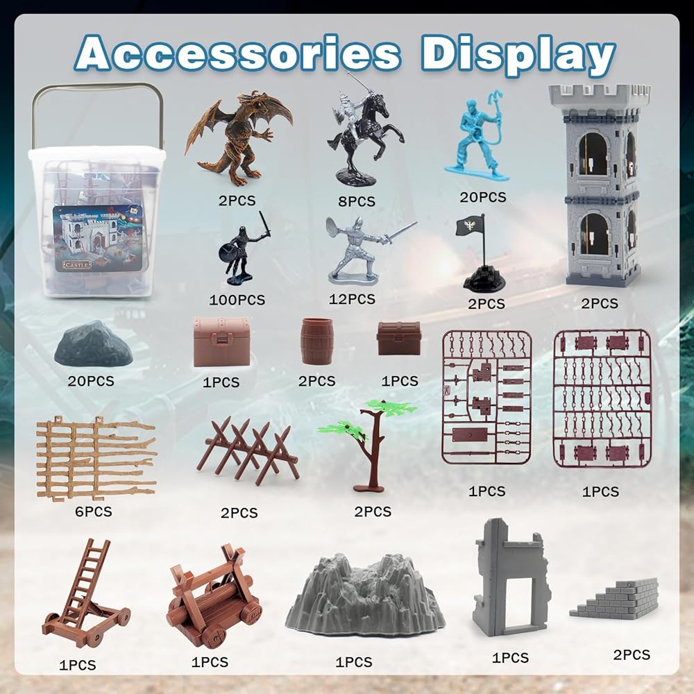 What in the Package This diy medieval castle toy set includes12 Soldiers in silver,20 Pirates in blue,8 knights, 8 horses, 100 mini soldiers in gray, 1 map, 2 trees, 6 fence, 2 dragons,1 ruins, 20 stones, 2 flags, sentry post,arrow Tower,accessories for drawbridge. A good knight castle toy for indoor and outdoor.