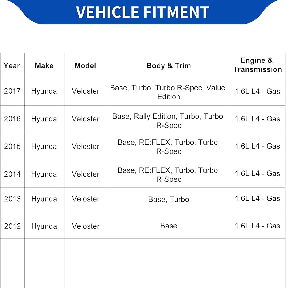 نماذج متوافقة: تناسب محركات Hyundai Veloster 2012-2017 1.6L Gas L4. لقاعدة هيونداي (عام 2012-2017)؛ لشركة هيونداي توربو (عام 2013-2017)؛ لشركة هيونداي ري: فليكس (عام 2014-2015)؛ لشركة هيونداي توربو R-المواصفات (عام 2014-2017)؛ لإصدار هيونداي رالي 2016؛ لسيارة هيونداي فاليو إيديشن 2017.