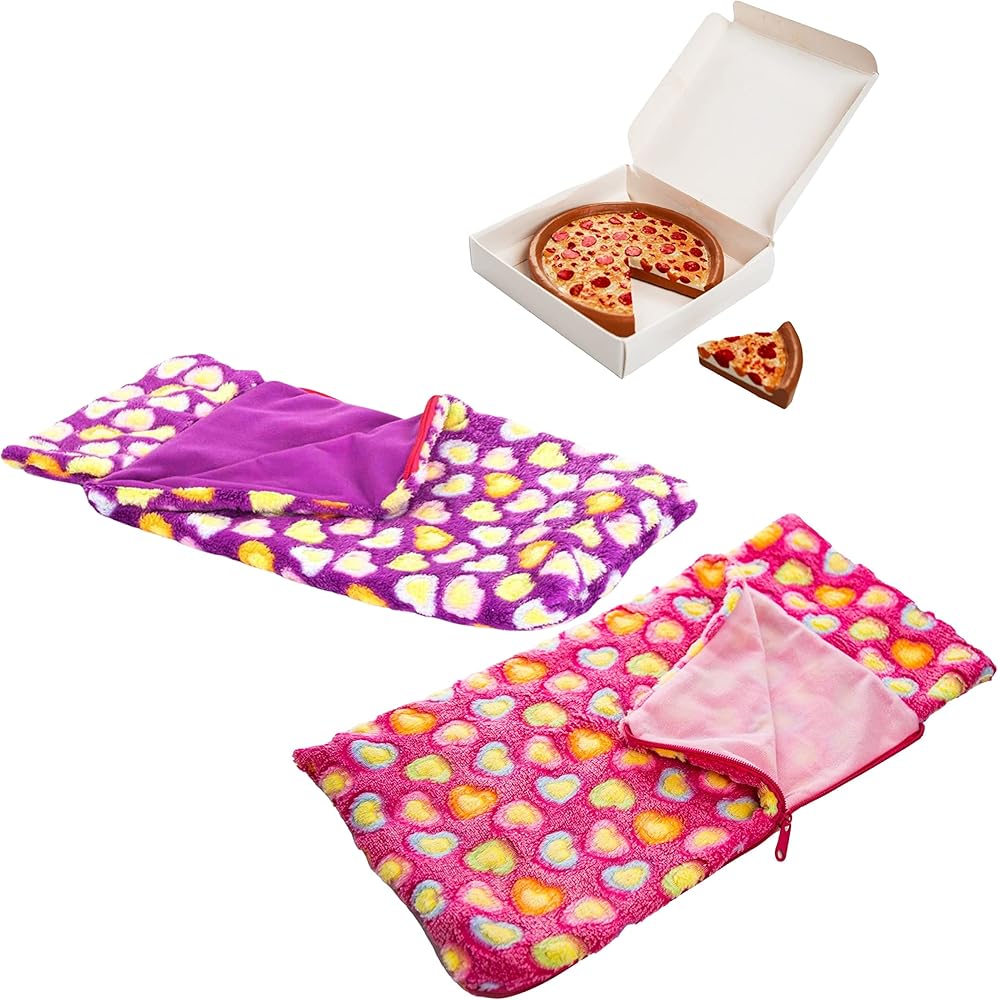 Pack the sleeping bags and get your 18 inch dolls ready for a sleepover and dinner! Included is one pink and one purple doll-sized sleeping bag and a pizza packaged in an authentic looking pizza box!