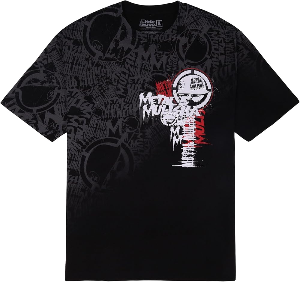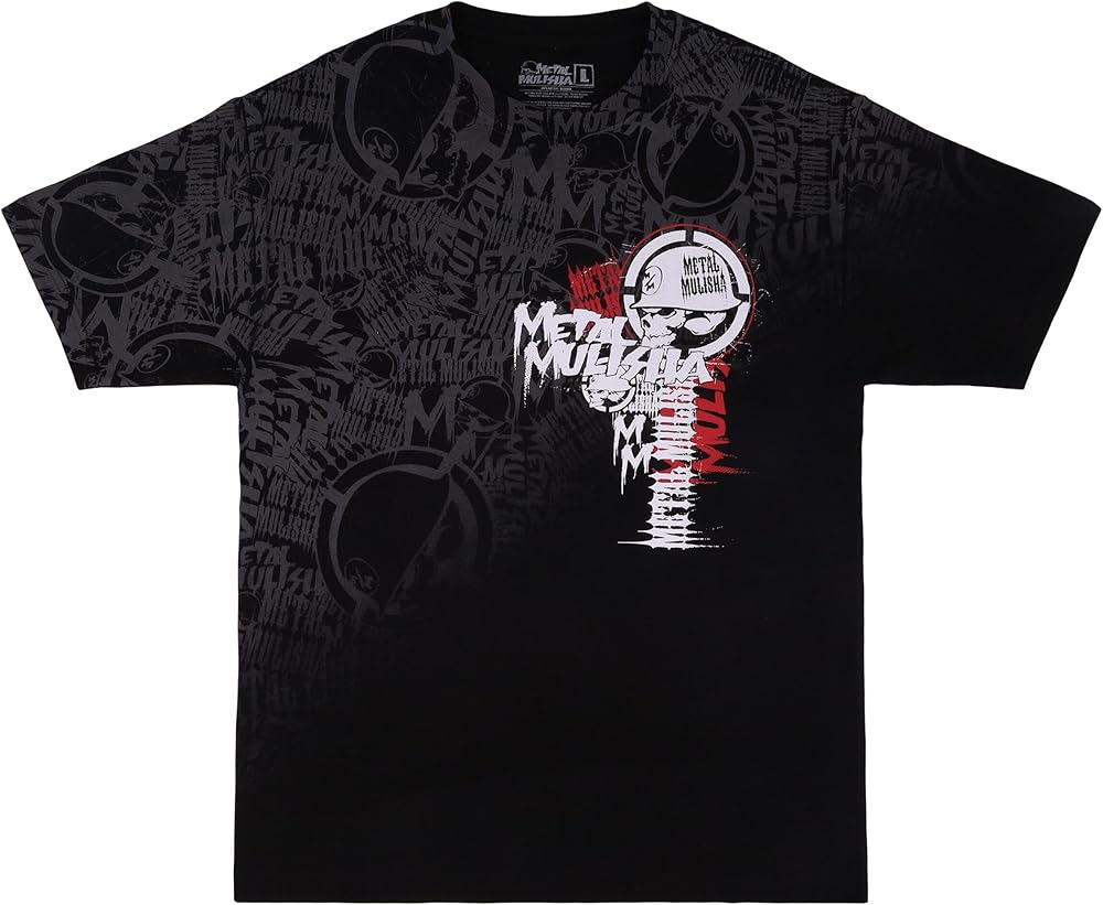 The Half Tone Tee in Black features an all over Metal Mulisha print on the front right side of tee and a Metal Mulisha logo in White and Red on the left front side.