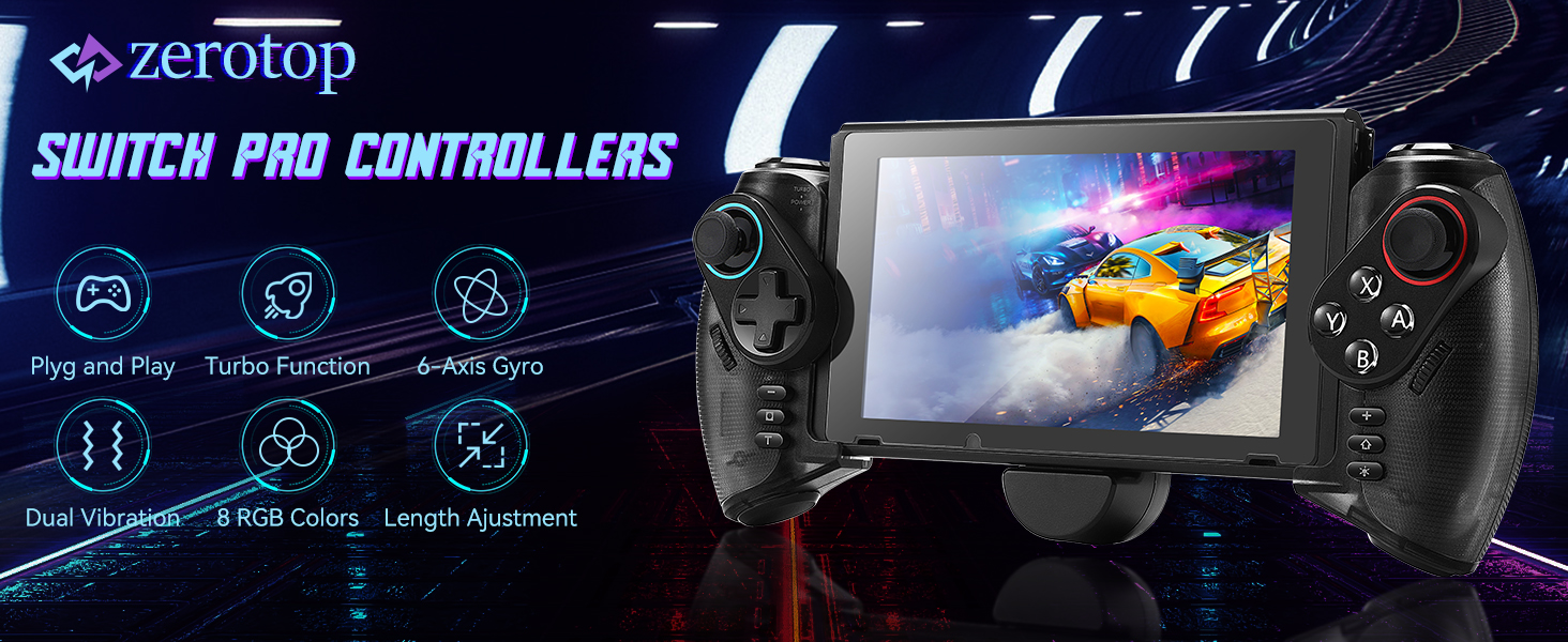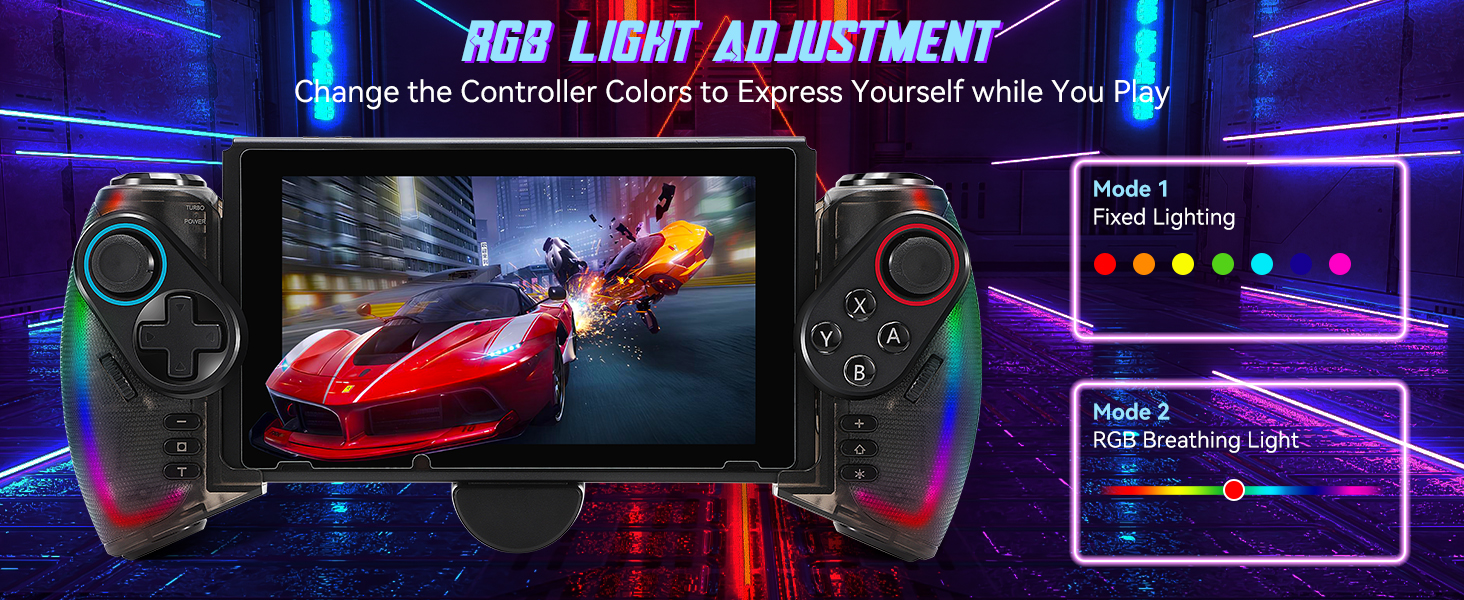 🎮【7 إضاءة RGB نابضة بالحياة】 تم تصميم بديل وحدة التحكم بالمفتاح مع 7 أنواع من أشرطة الإضاءة المحيطة RGB، كما يتضمن الضوء الحلقي في عصا التحكم 7 أوضاع إضاءة. مما يسمح لك بتخصيص تجربة الألعاب الخاصة بك وإضفاء طابع شخصي عليها، وإضافة عنصر جذاب بصريًا. (اضغط على زر الضوء لاختيار ضوء لون واحد، الافتراضي هو ضوء متدرج. انقر لتبديل الألوان).