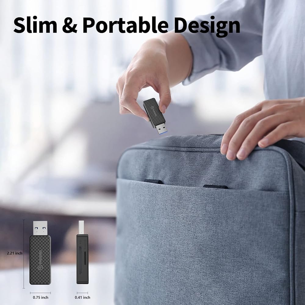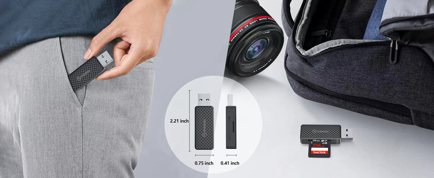 【سهل الحمل】الحجم الصغير لقارئ بطاقات USB هو 56 × 19 × 10.5 ملم. يمكنك حملها بسهولة في حقيبتك أو جيبك عند السفر أو التصوير. بحجم الإبهام، ومحمول للأعمال.
