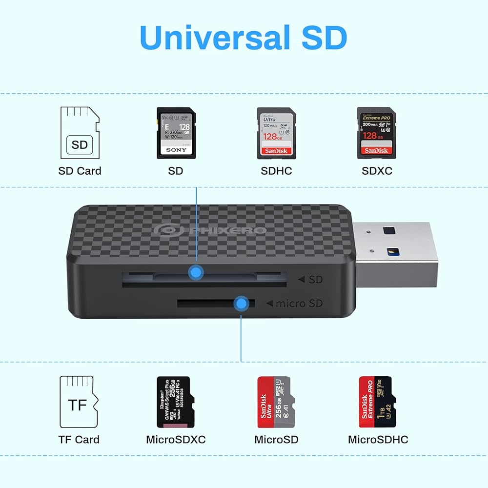 قارئ بطاقات SD من PHIXERO لبطاقة ذاكرة الكاميرا، قارئ بطاقات Micro SD/SD 2 في 1 USB C مع قارئ بطاقات ذاكرة فائق السرعة 5 جيجابت في الثانية متوافق مع الكمبيوتر بمنفذ USB-A والمزيد من أجهزة USB A