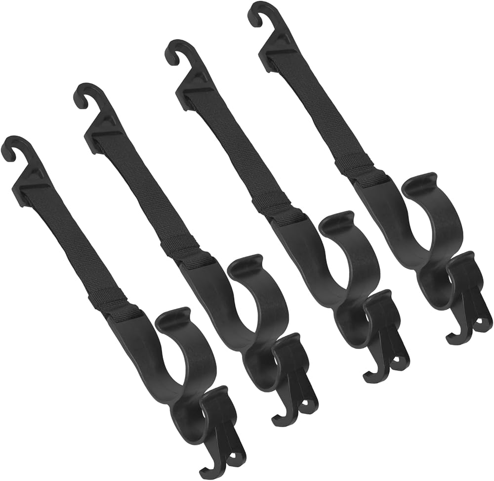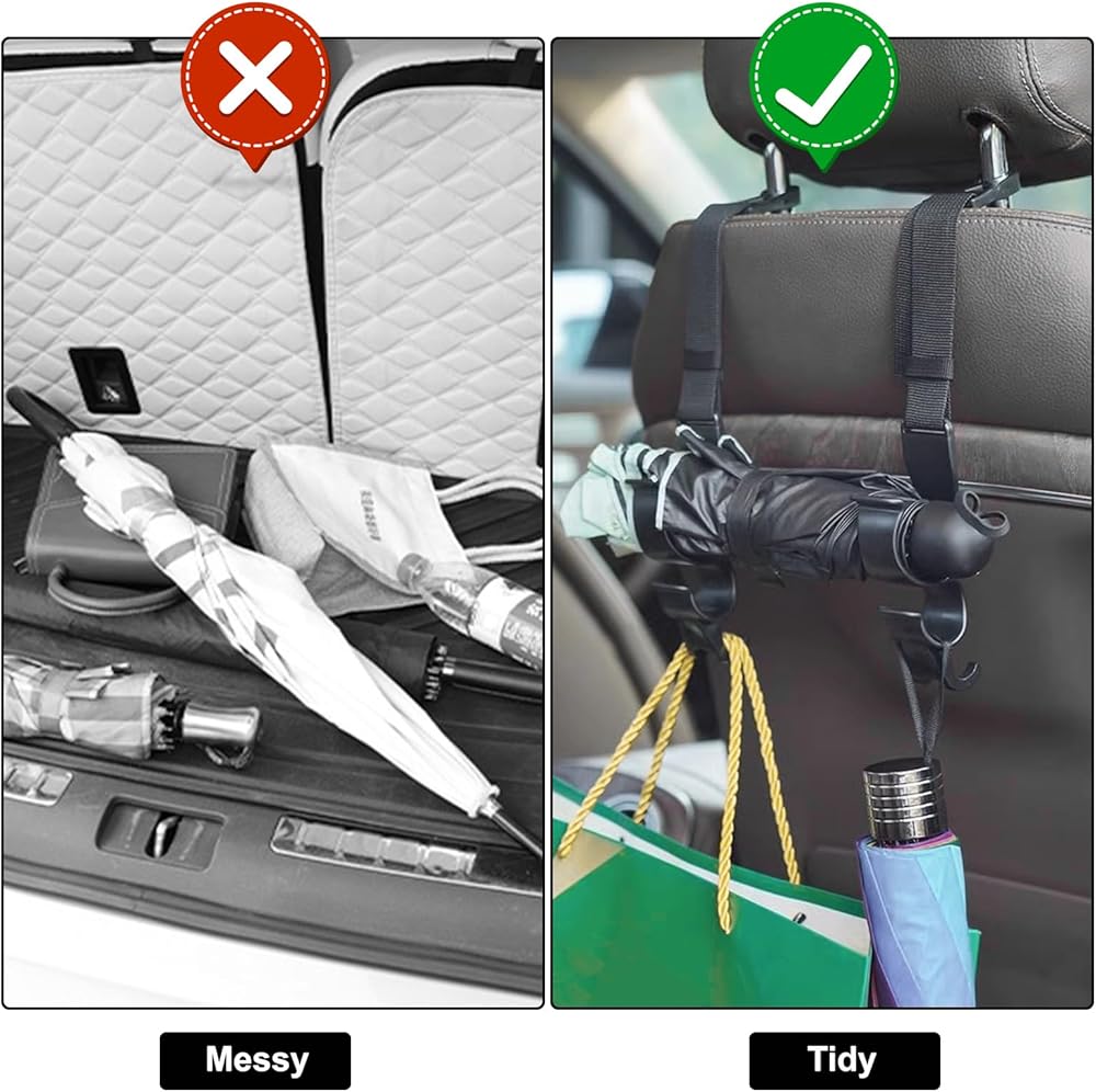 STURDY AND DURABLE: This HEAVY DUTY headrest hooks are well made of EXCELLENT QUALITY material. They are very sturdy for your heavy purse or groceries and designs allow HANG MORE and more stuff than others. And the nylon fabric strap makes them more durable than all plastic ones, they are magic headrest hooks for car.The headrest hooks keep your bag from FALLING OVER and contents SPILLING all over the floor when you make a turn too quickly or have to stop suddenly. It will make your car more organized, NO MORE MESSY seat or floor when you hang a trash bag instead throw everywhere on the trip.