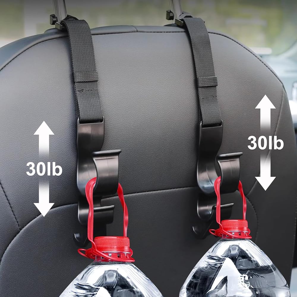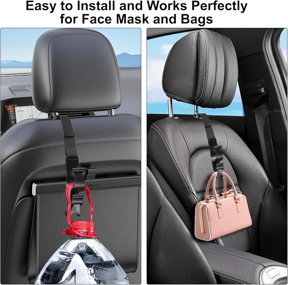SECURE AND ORGANIZED: You will no longer have to put the stuff on the floor or the seat. The headrest hooks are so convenient to hang your PURSE, BAGS, water-bottle, backpack, handbag, jacket and KEEPS THEM WITHIN REACH. Especially as a Woman, it is useful to keep the bags from rolling around in the car.