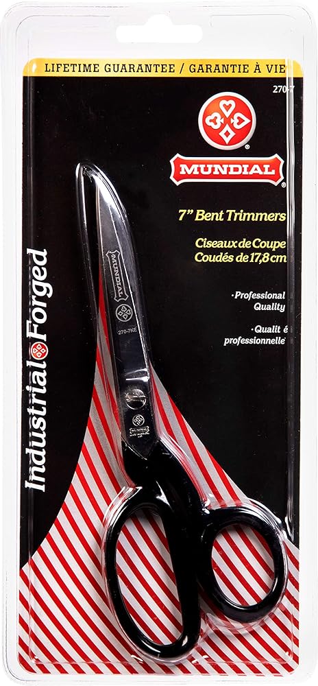 The Mundial 7" Industrial Forged Bent Trimmers are the perfect tool for professional and hobbyist sawists alike. These durable scissors are designed to withstand the rigors of industrial use while providing the precision and comfort needed for intricate fabric work. The hot drop forged, nickel-plated carbon steel construction ensures lasting sharpness and resistance to wear and tear. The bent handle design keeps fabric flat on your cutting surface, preventing shifting and ensuring clean, accurate cuts every time. The ergonomic black enameled handles provide a comfortable grip, reducing hand fatigue during extended use. Whether you're a professional dressmaker, tailor, or quilter, or simply enjoy sewing as a hobby, these Mundial Bent Trimmers are an essential addition to your toolkit. Their precision blades, comfortable design, and industrial strength make them the ideal choice for cutting a wide range of fabrics with ease and accuracy.