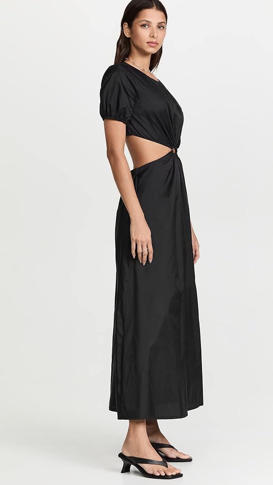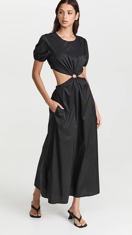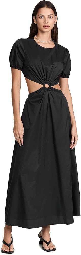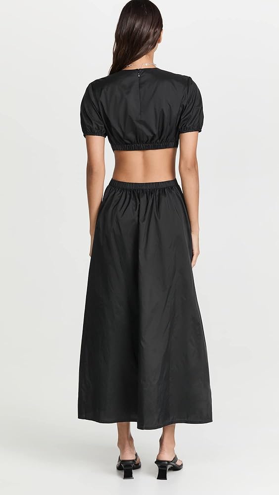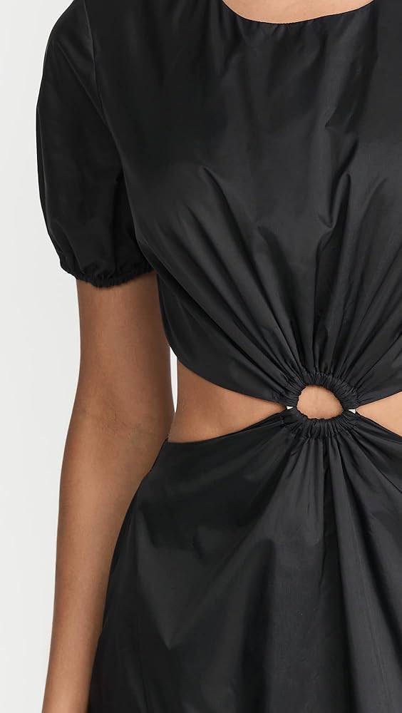 A minimalist yet eye-catching STAUD dress, featuring a two-piece silhouette, crisp black fabric, and a covered ring accent at the waist. Just add simple heeled sandals to complete your outfit.