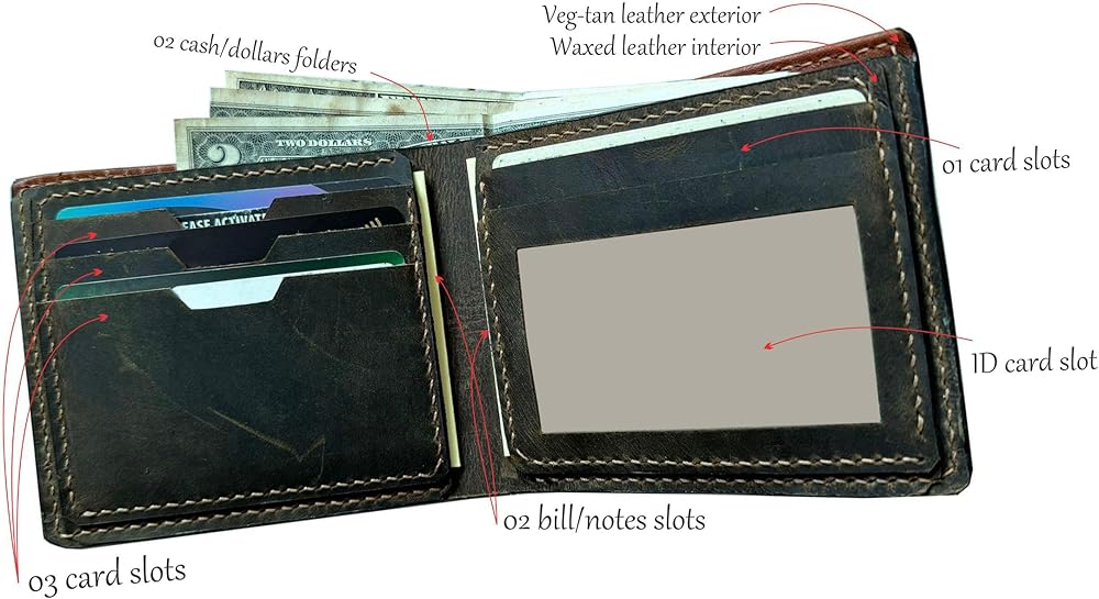 هيكل بسيط: تحتوي المحفظة الجلدية الرجالية المصنوعة يدويًا على 06 فتحة للبطاقات، و02 حافظة كبيرة للنقود، و02 طيات متوسطة للفواتير/الملاحظات. إنها محفظة بسيطة، نحيفة ورفيعة، تناسب الجيب الأمامي ولكنها توفر مساحة كافية لاستخدامك اليومي.