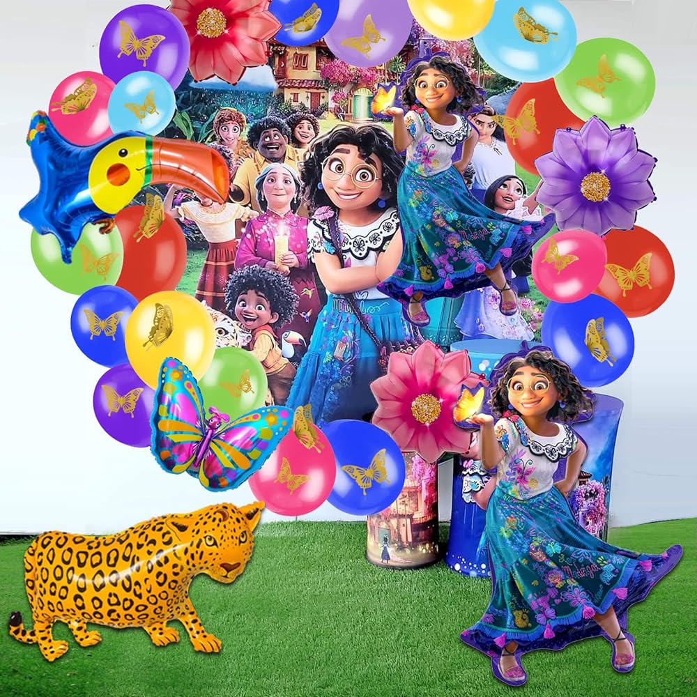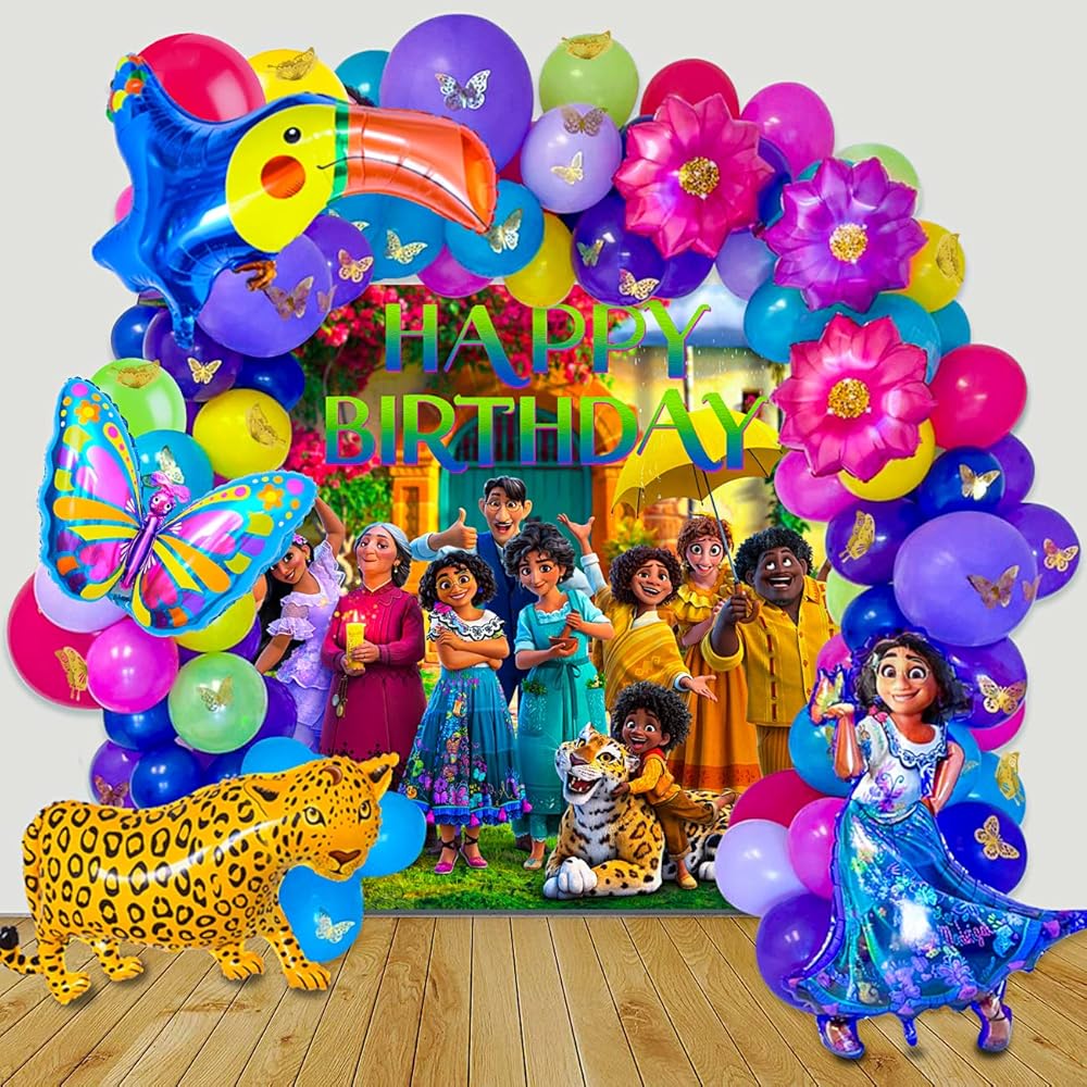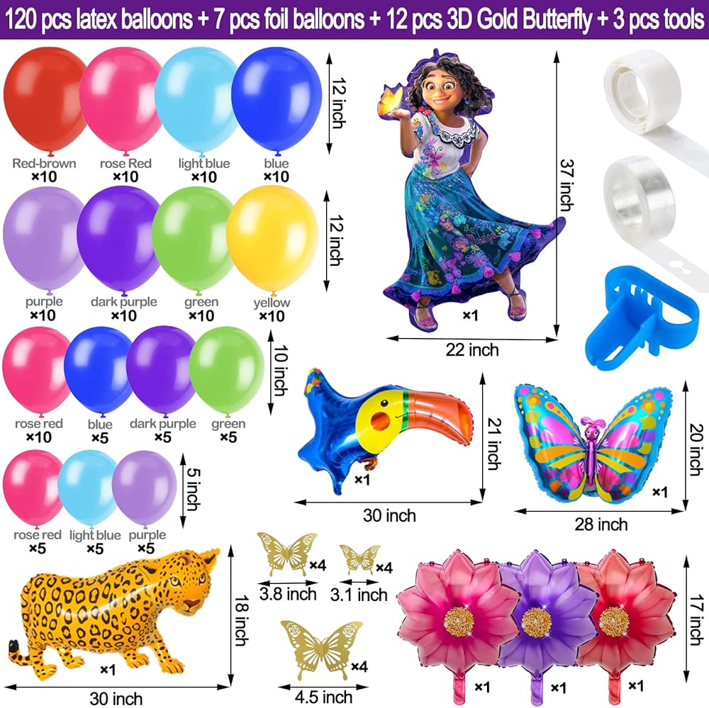 【Package Includes】 120pcs latex balloons with different color and size, 1pcs Mirabel Foil Balloon, 1pcs Butterfly Foil Balloon, 1pcs Toucan Foil Balloon, 1pcs Jaguar Balloon, 3pcs Flower Foil Balloons, 12pcs gold butterfly, balloon arch strip, dot glue, tying tool.